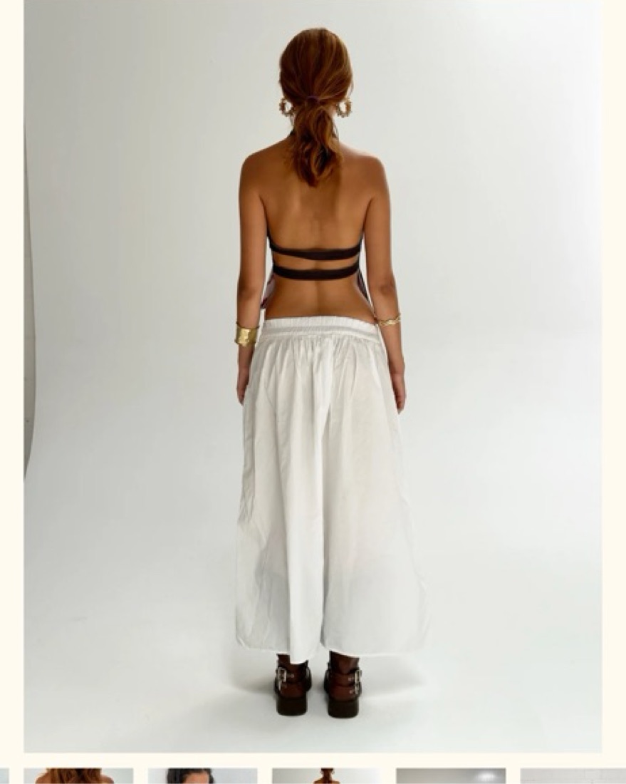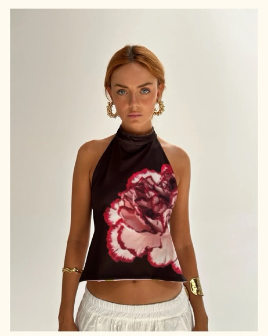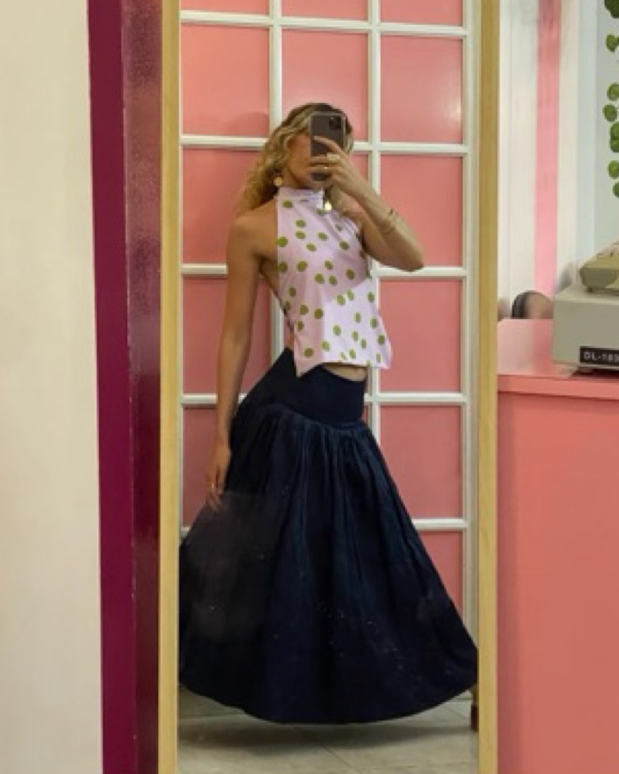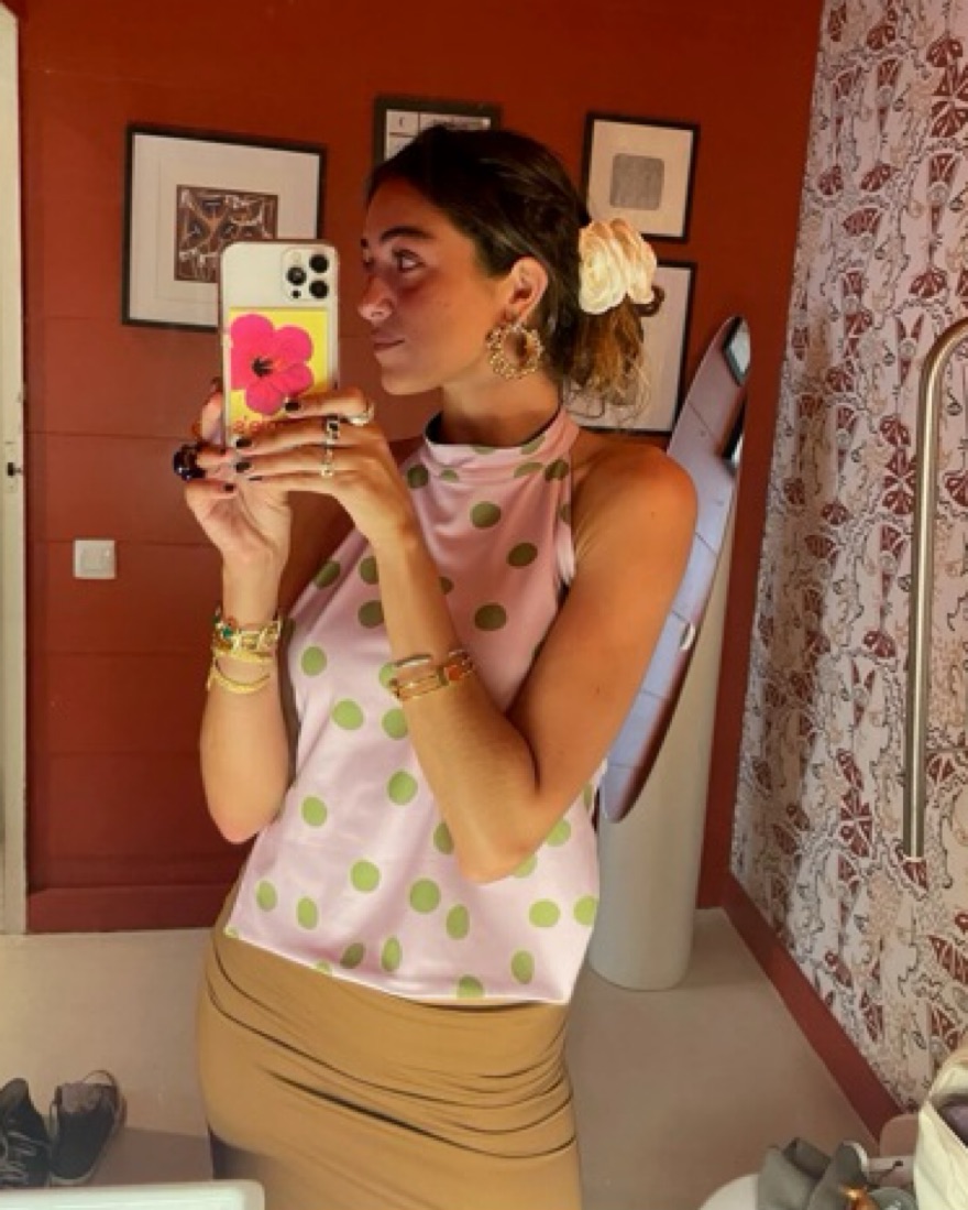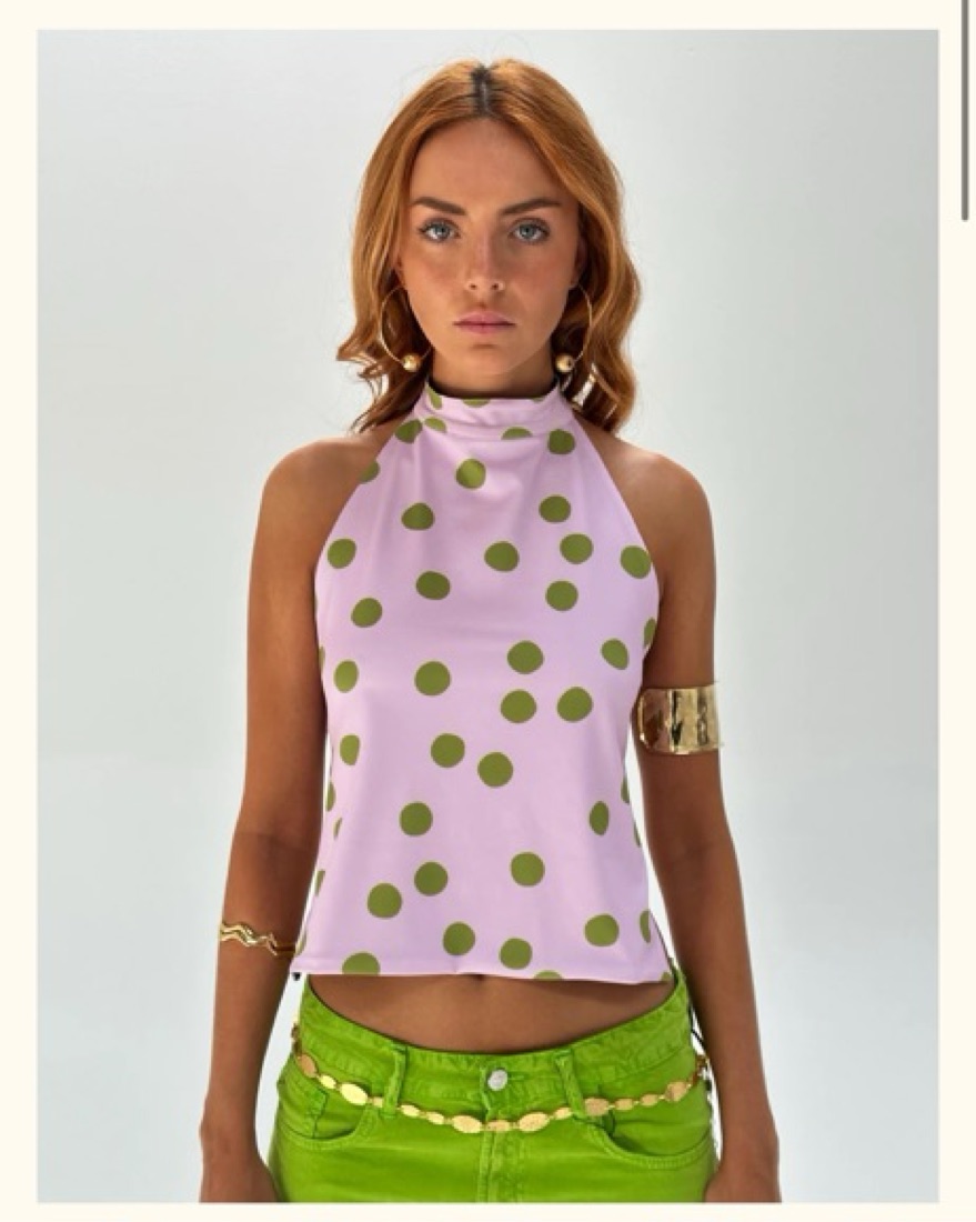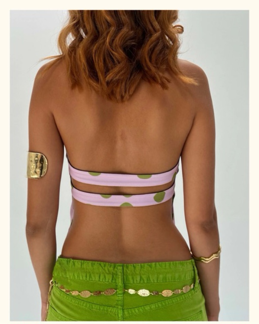 Polka dot one side and black floral other. One size fits most! XS-M is best.