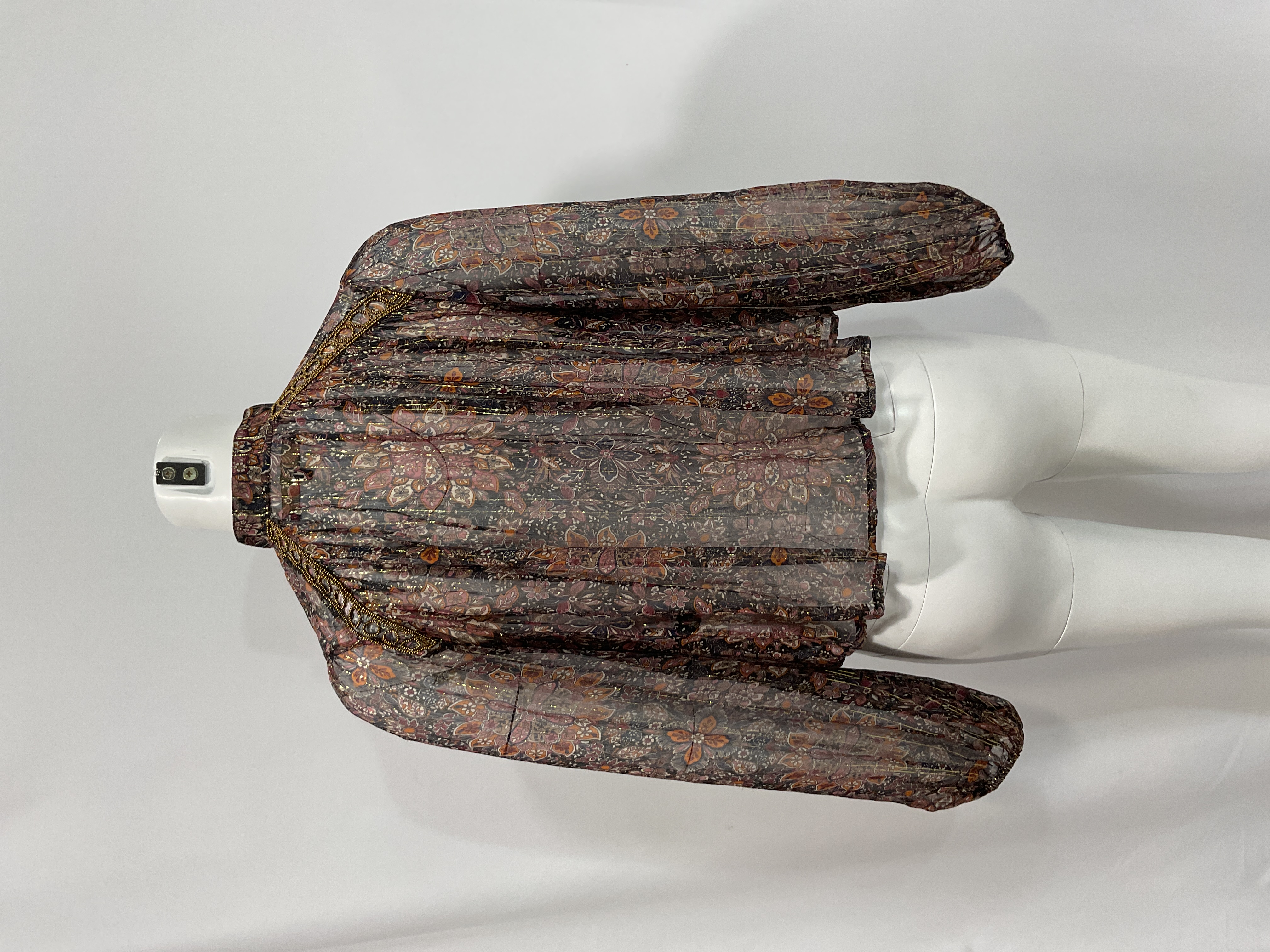 Shimmer in rust florals with eye-catching metallic accents. Perfect for fall brunches or evening events when you want to stand out.