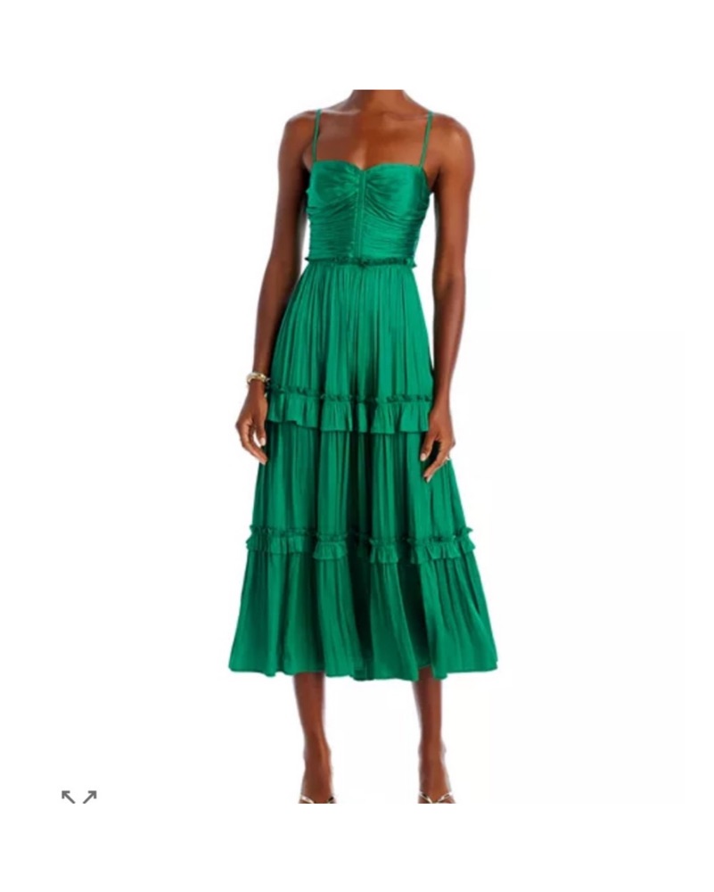 This stunning green midi dress features a ruched bodice and cascading tiered skirt, perfect for a garden party or summer wedding.