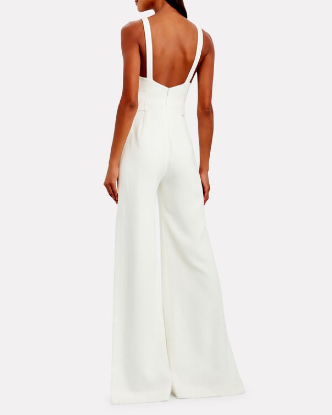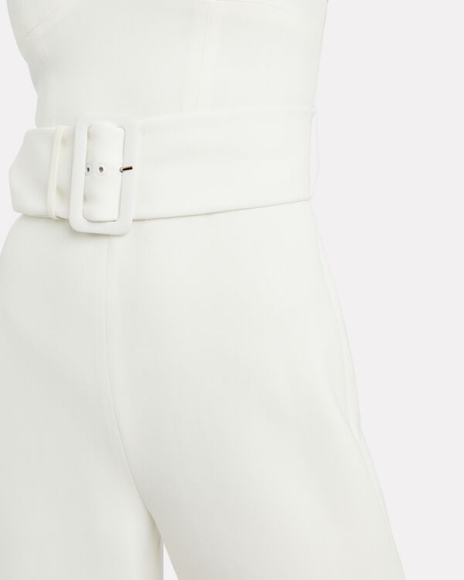 Tailored in crisp crepe, this sleeveless jumpsuit falls in an exaggerated wide leg silhouette with thigh-grazing slits. Attached belt. Back zip closure.