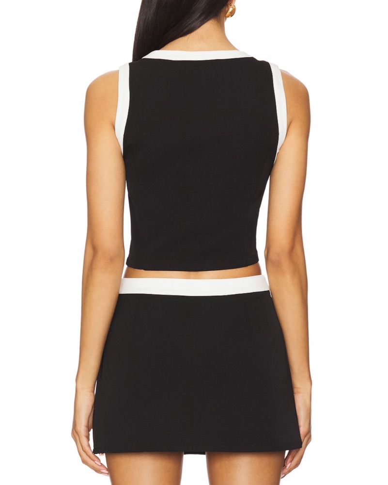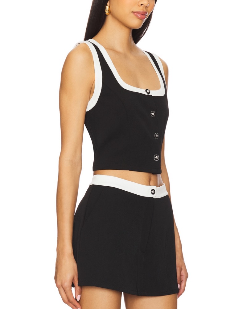 Black top and skirt set with white trim and button detailing. Size small top and medium bottoms.