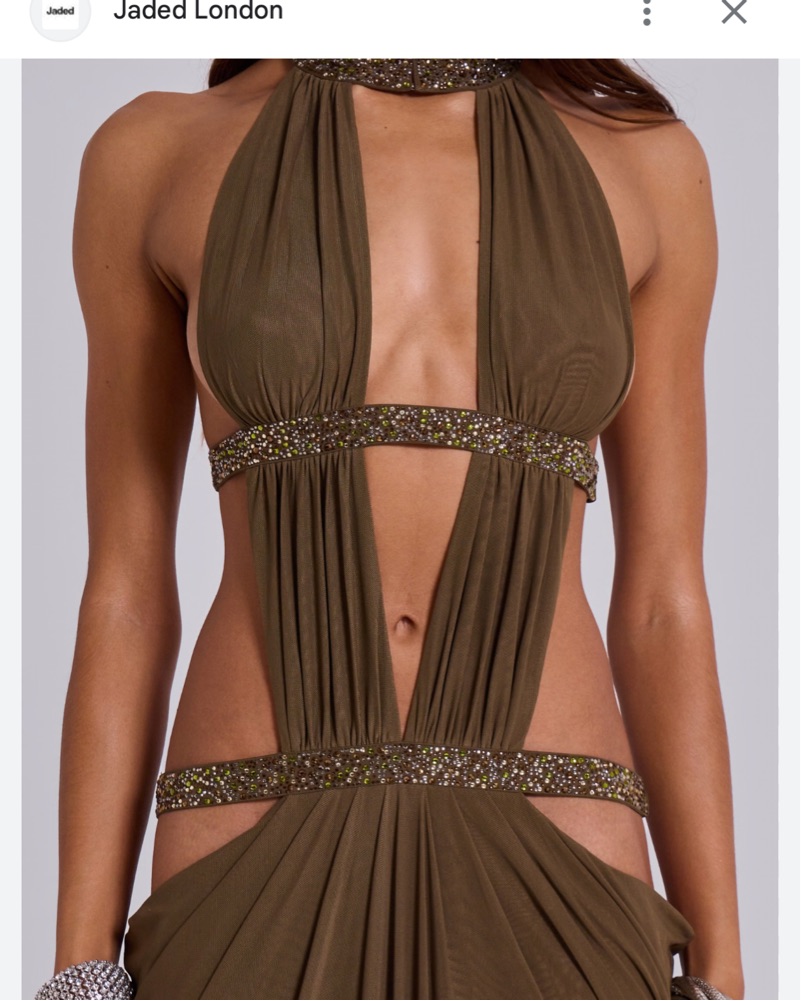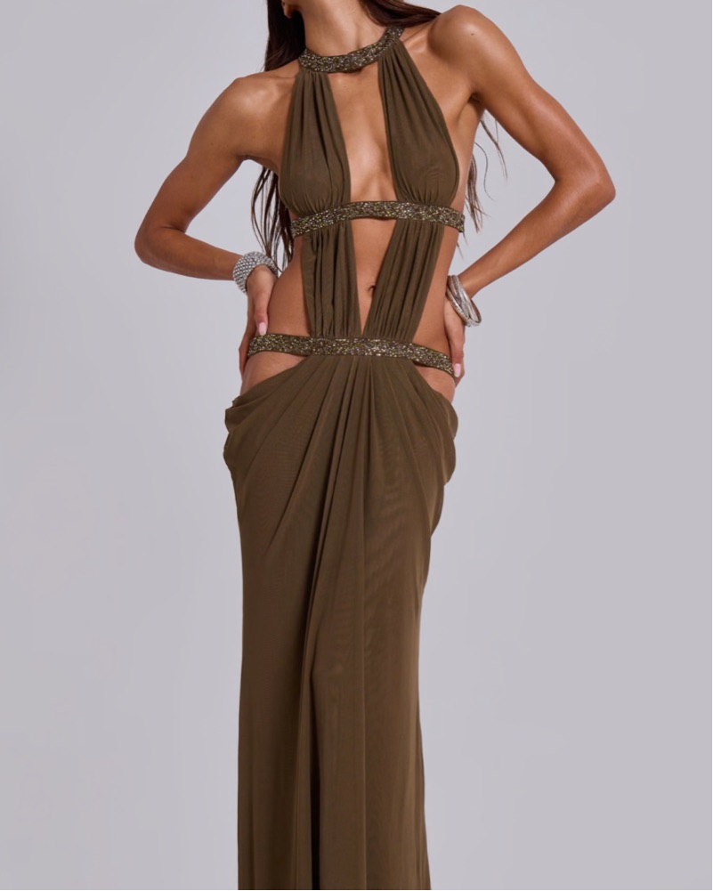 A full after-dark statement dress. This khaki halter maxi features dramatic cutouts, plunging neckline, open sides, and embellished bands that contour the waist and hips. Fluid, body-skimming fabric with serious movement. Made for Ibiza nights, desert dinners, rooftop parties, destination weddings,