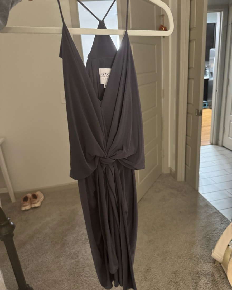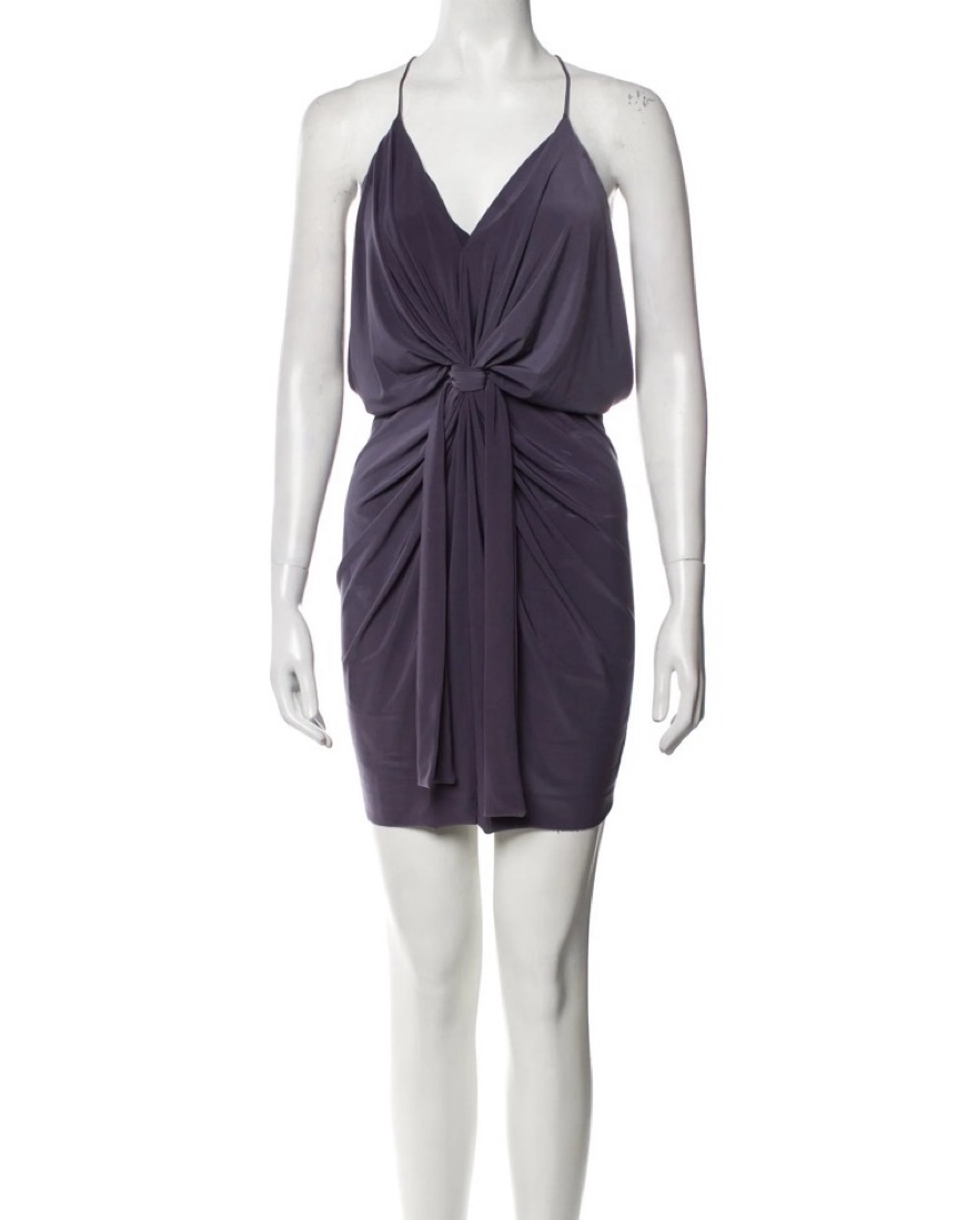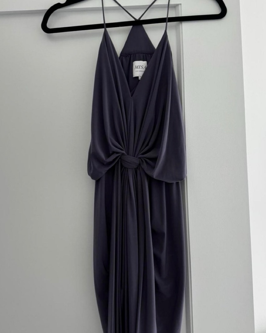 Gorgeous gray mini dress from misa. Knotted at the waist and draped just right, this sleek MISA Los Angeles dress is effortless. Beautiful draping. Buttery soft. Can also double as a top with pants! The dress is true to color like in the second, third and fourth photos. Purchased at planet blue