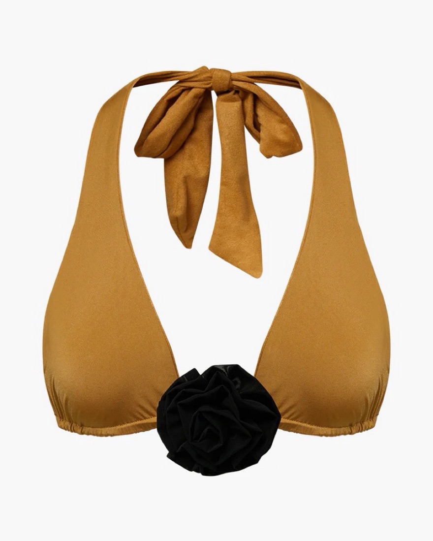 Our halter bikini top is fully lined and has sashes that tie at the back and behind the neck for an adjustable fit.