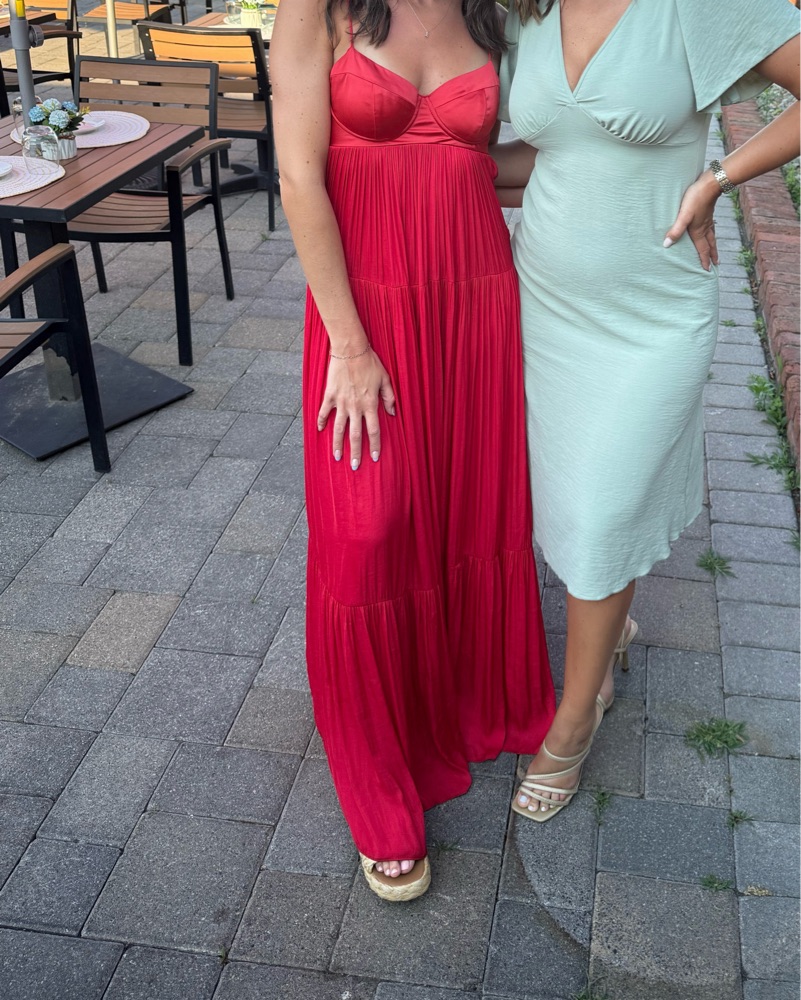 Free People Maxi dress in tiered silhouette featuring silky bustier-inspired top piecing Adjustable straps and back tie closure. Worn once! Color: bright red
