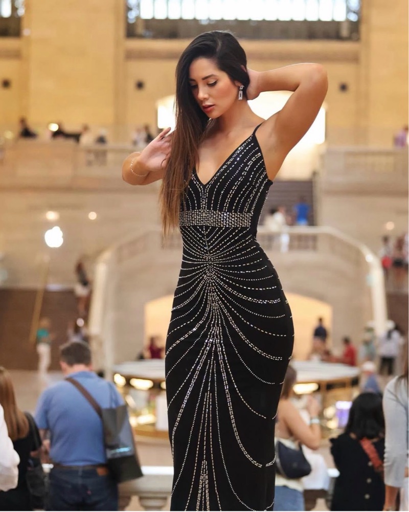 This stunning, sequin-encrusted black gown is perfect for making a dramatic entrance at any formal event. The form-fitting silhouette and sparkling embellishments create an eye-catching, glamorous look.