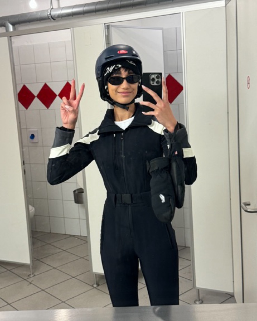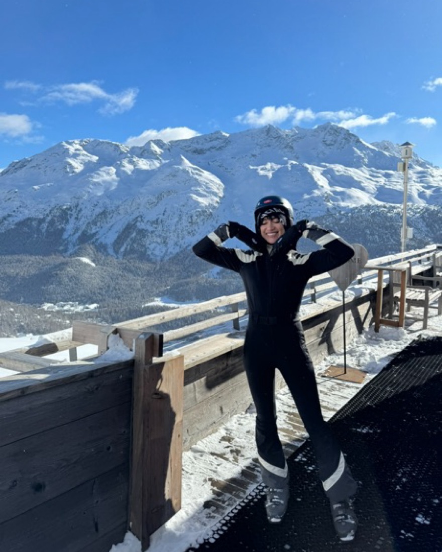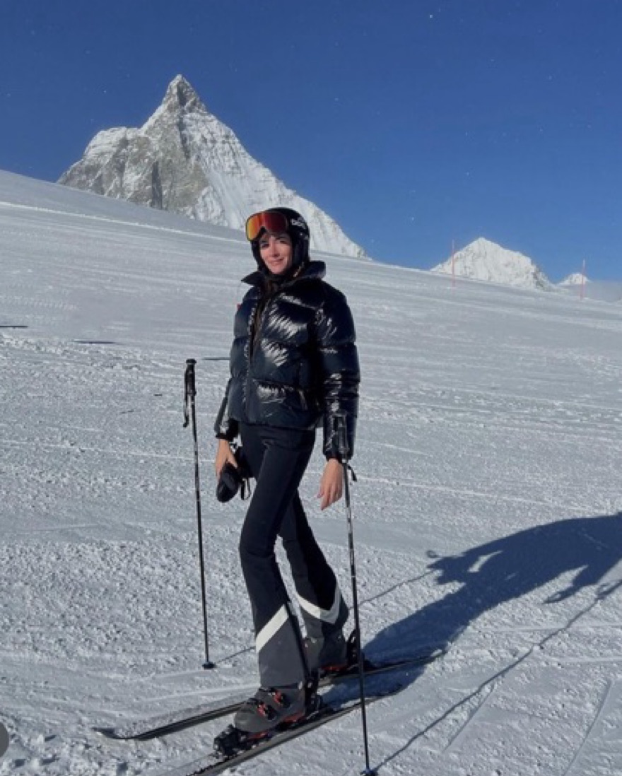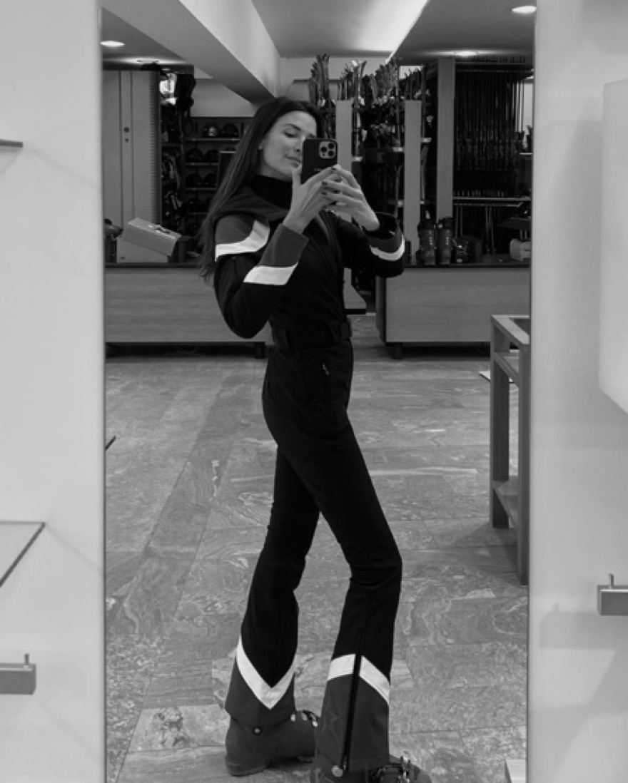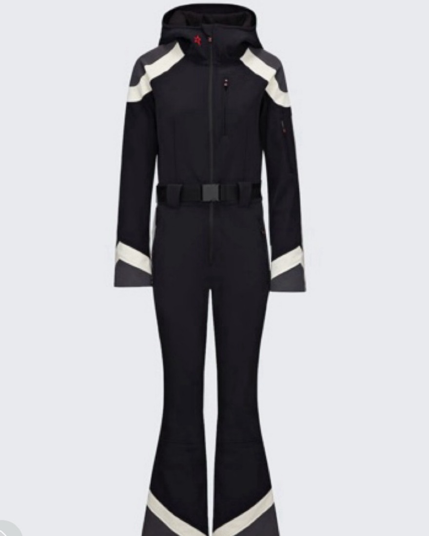 Warm, one piece perfection. As seen in St. Moritz. The perfect black ski suit. Looking sleek on the mountains guaranteed.