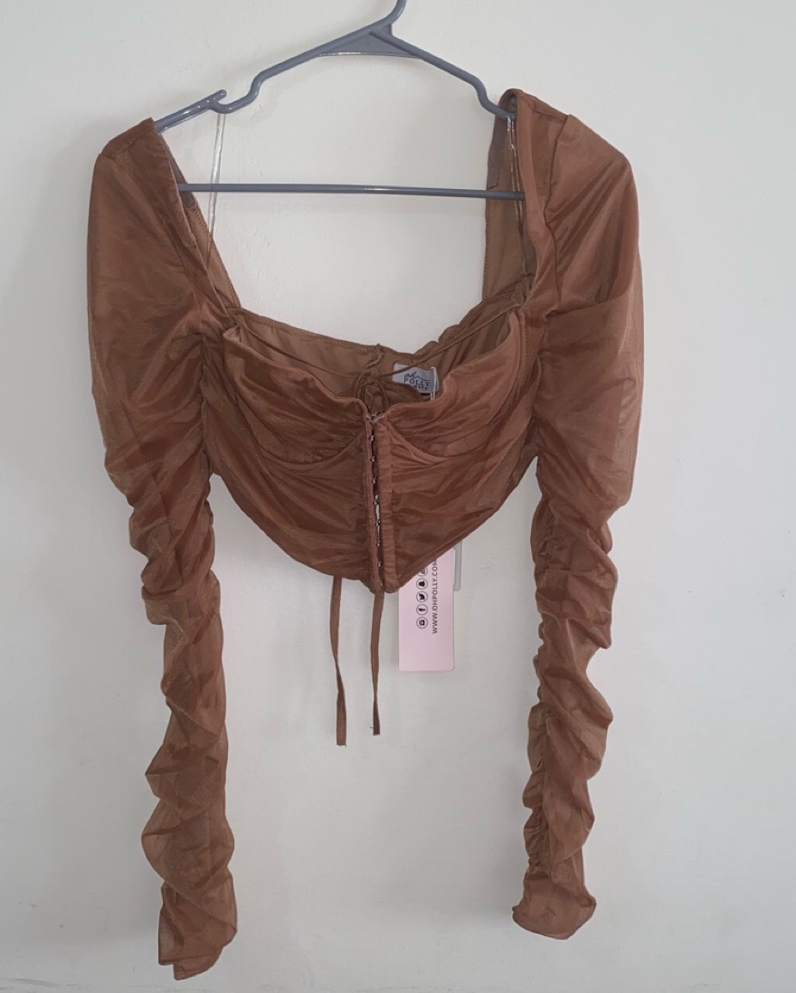 stretch mesh fabric, Noelle features hook and eye front detailing and full body ruching to cinch in your waist. Complete with long ruched sleeves and a bust flattering halterneck tie, Noelle is designed to bring the party to any event.Functional halterneck strap
