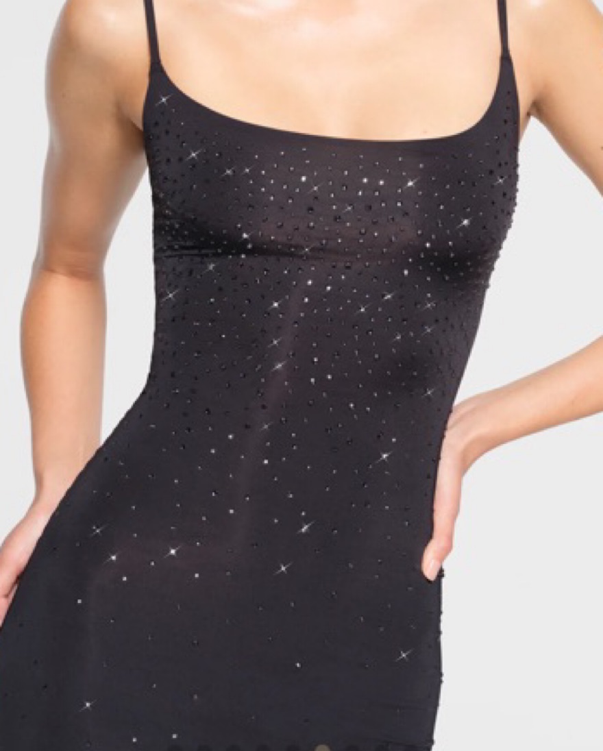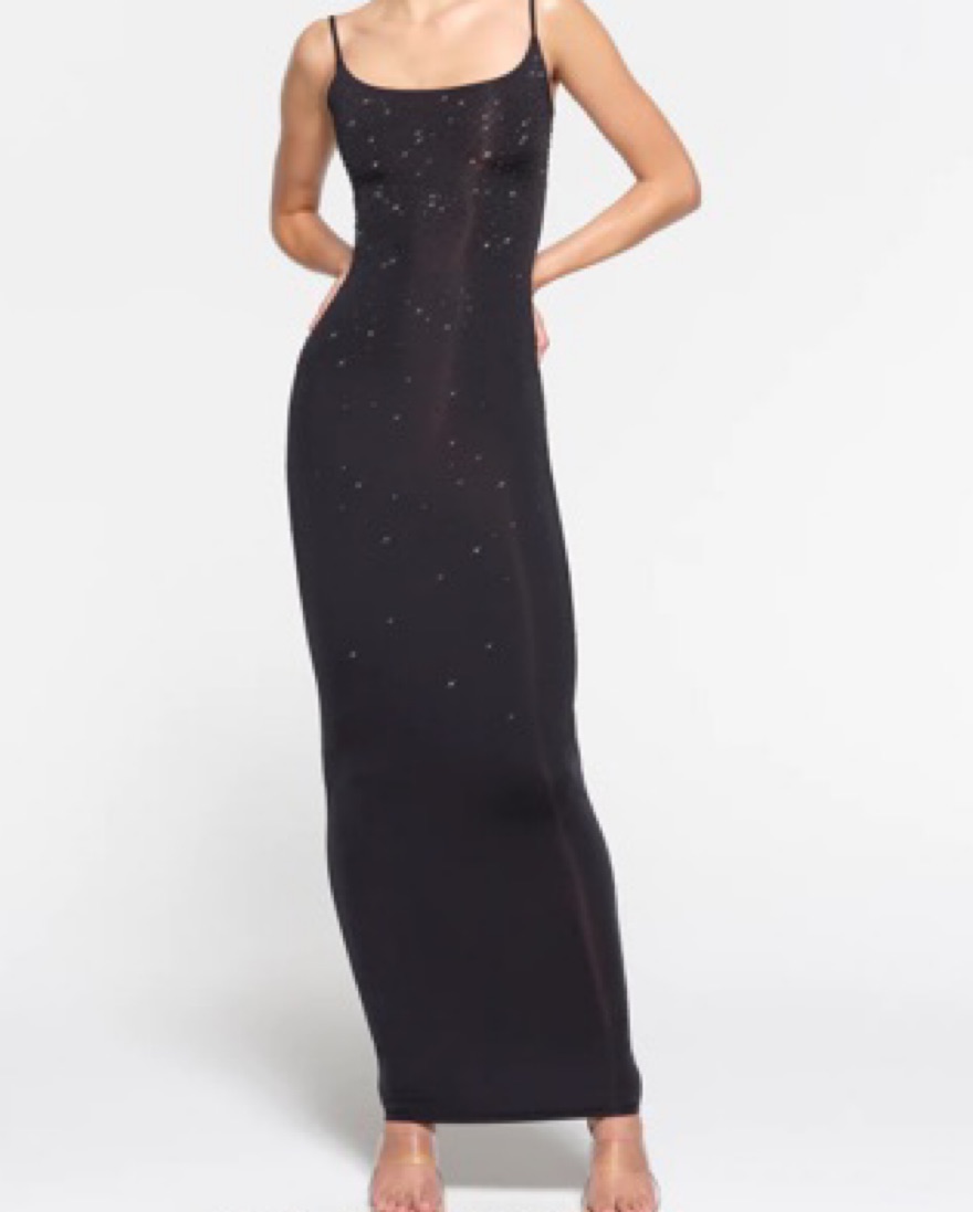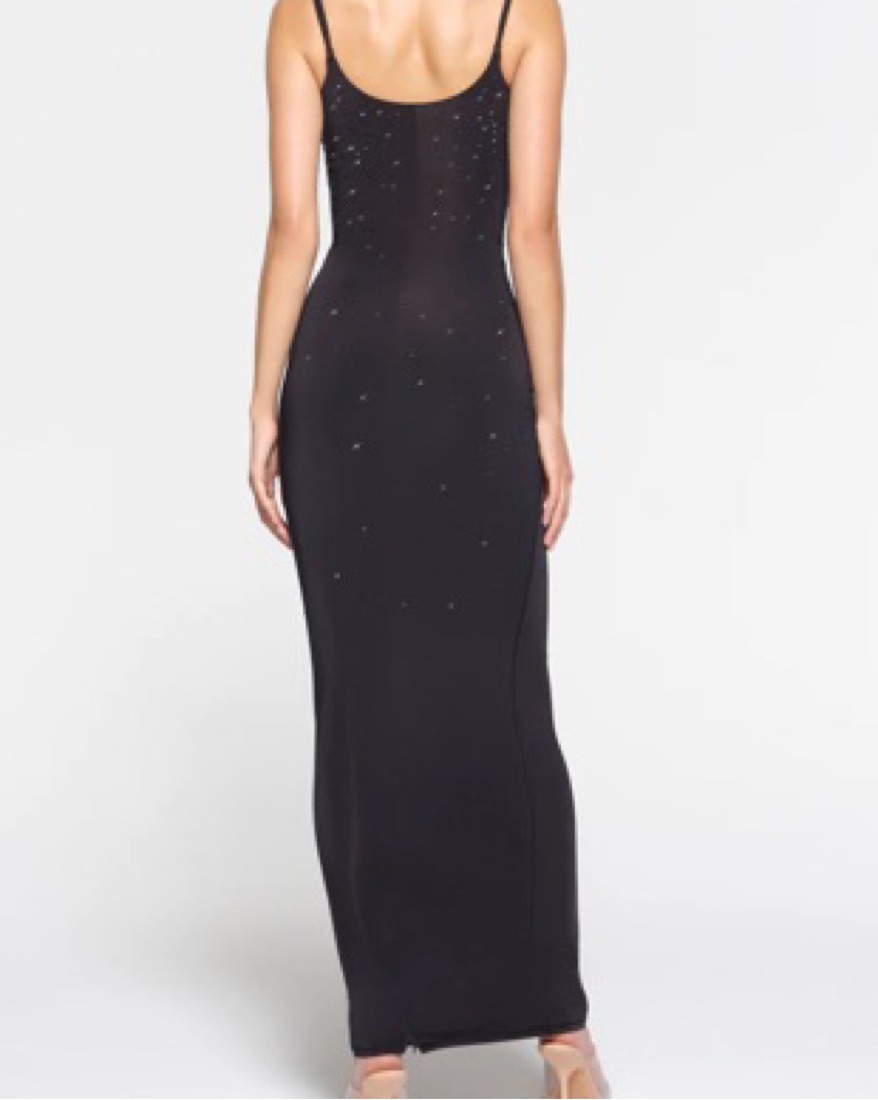 Classic long dress silhouette in the silkiest fabric now designed with thoughtfully placed Swarovski crystals throughout. Part of the limited-edition Swarovski x SKIMS capsule collection. Delicate! Dry Clean only - damages will be charged