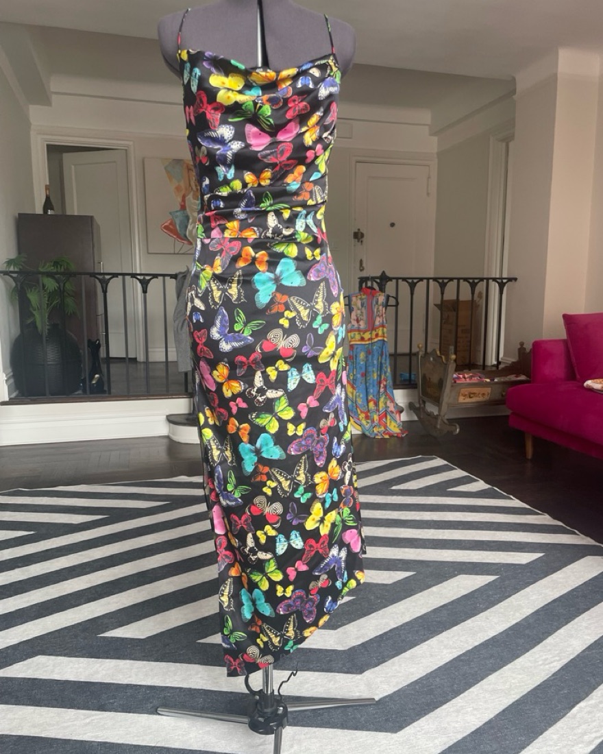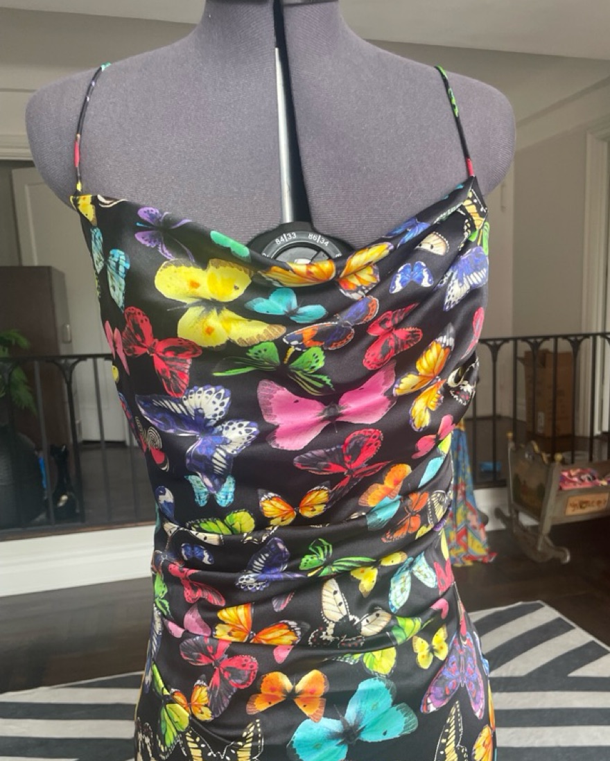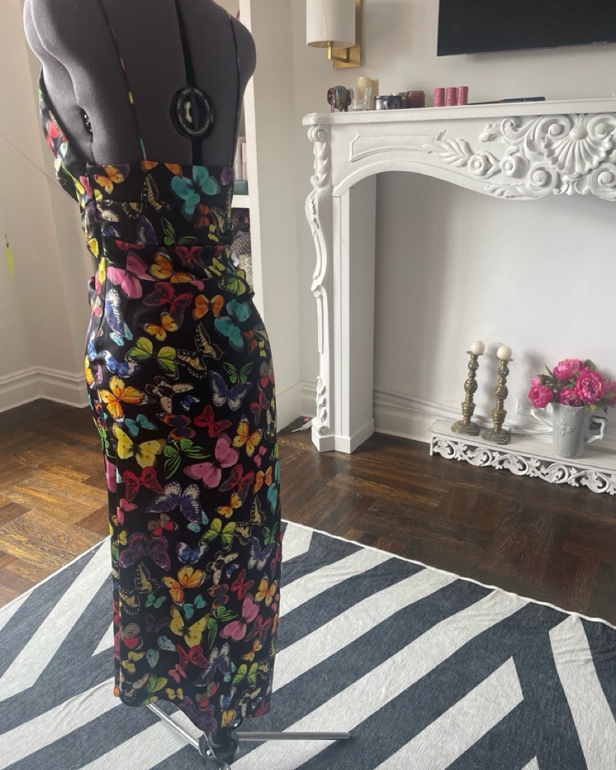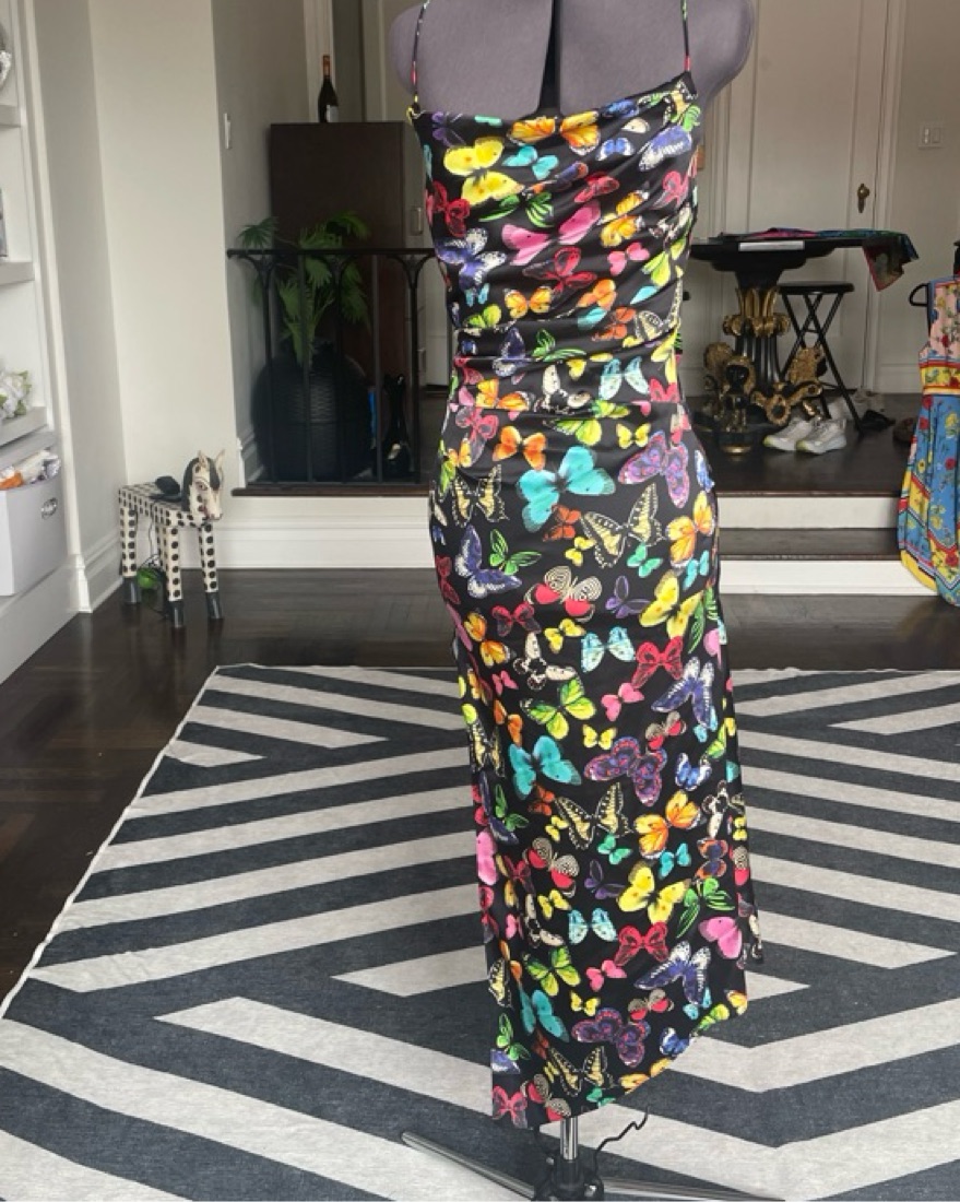 Amazing dress with an asymmetrical hymn and slit upside. This is a sample so it does run pretty small but it should fit size 0 to 2.