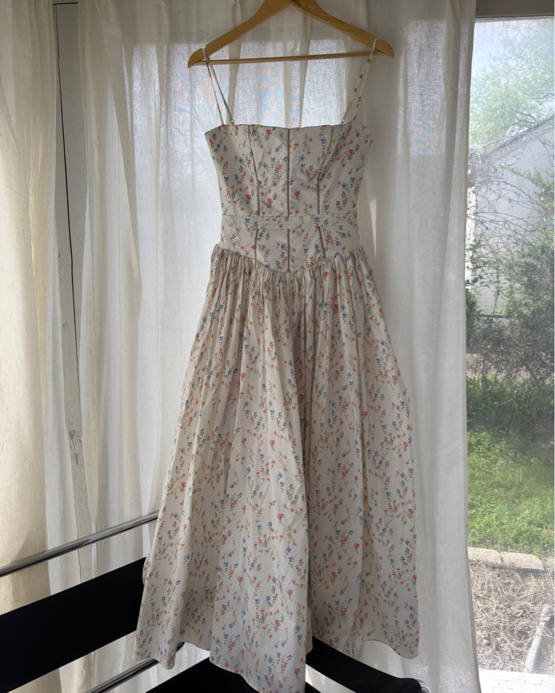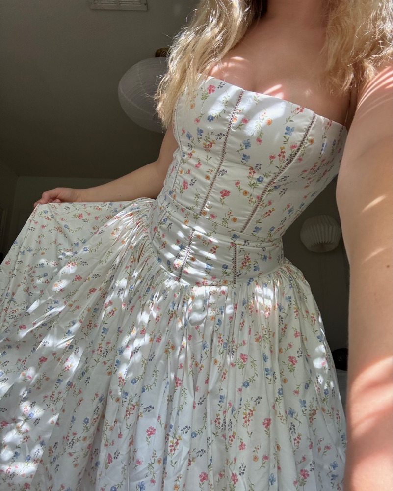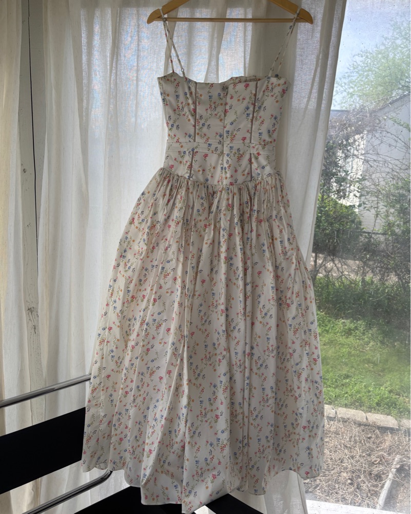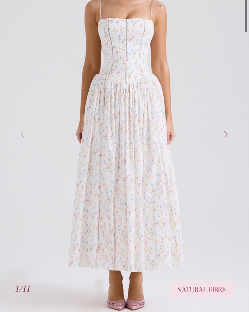 House of CB Ysabella White Posy Print Cotton Maxi Sundress. perfect for a bridal event, summer girly event, etc. Size small with bigger cup! I’m bra size 28G for reference and it fits perfectly. Please dont rent if you’re planning on using fake tanner! Item is priced for dry cleaning after each us
