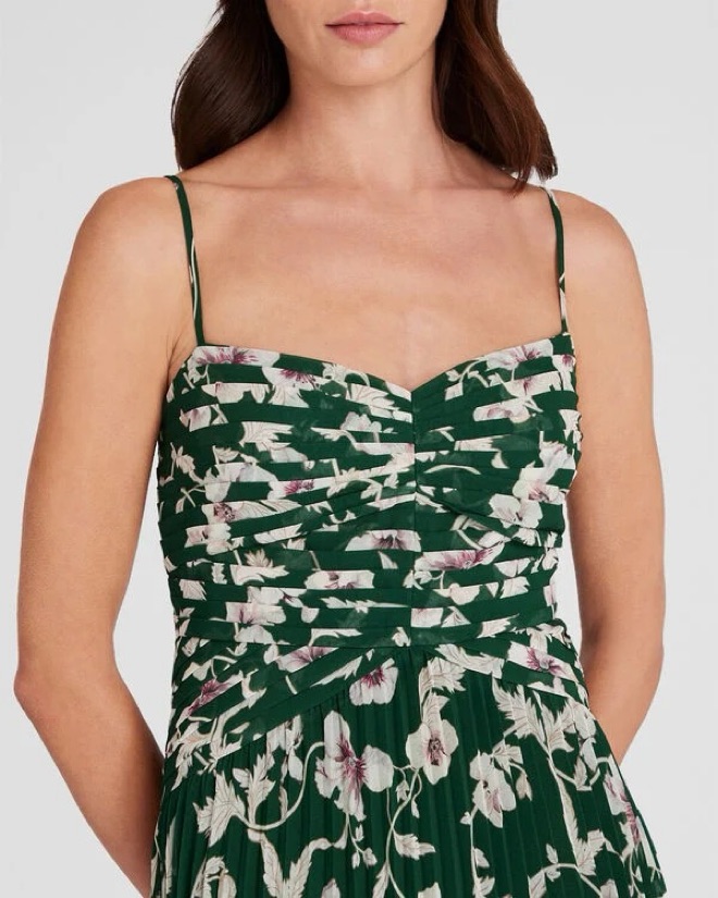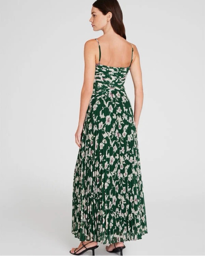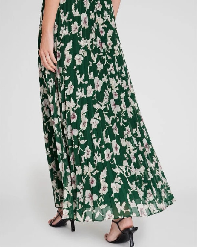 Green printed chiffon gown with pleats - perfect fall or spring wedding guest dress