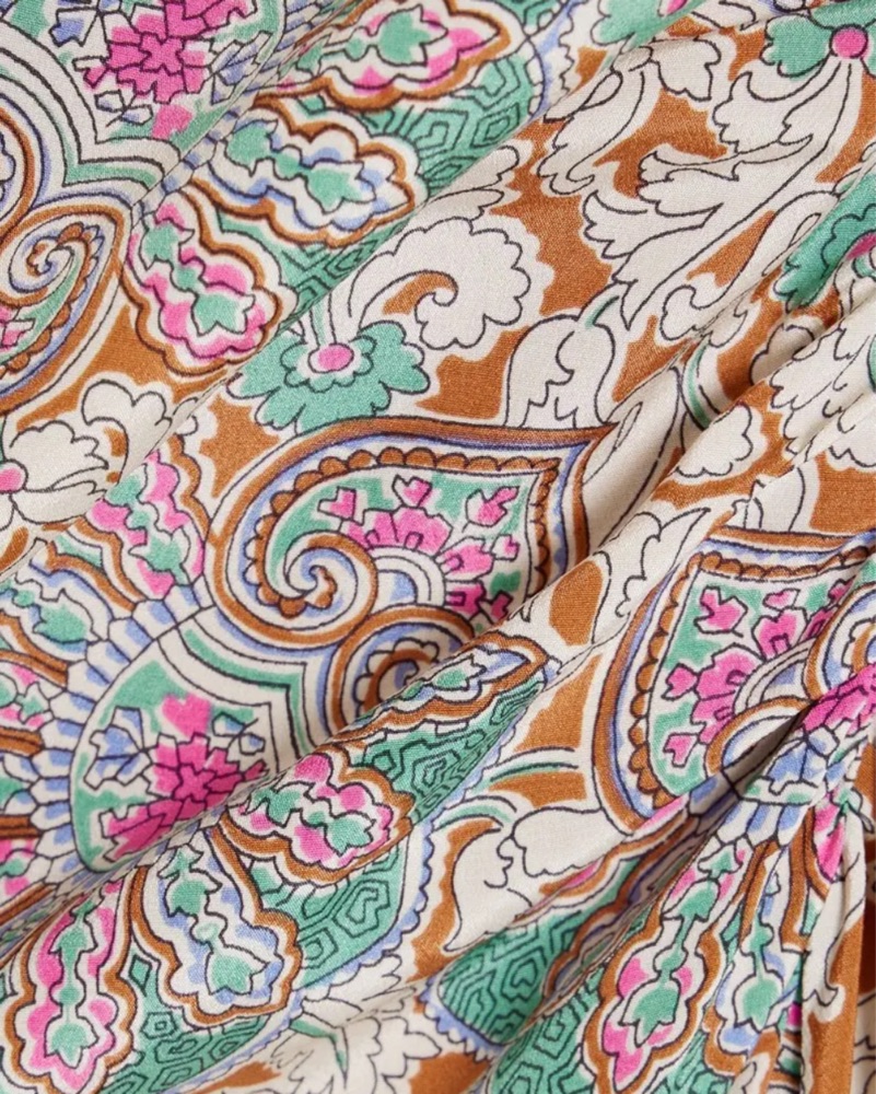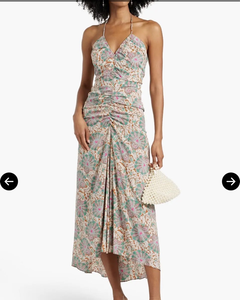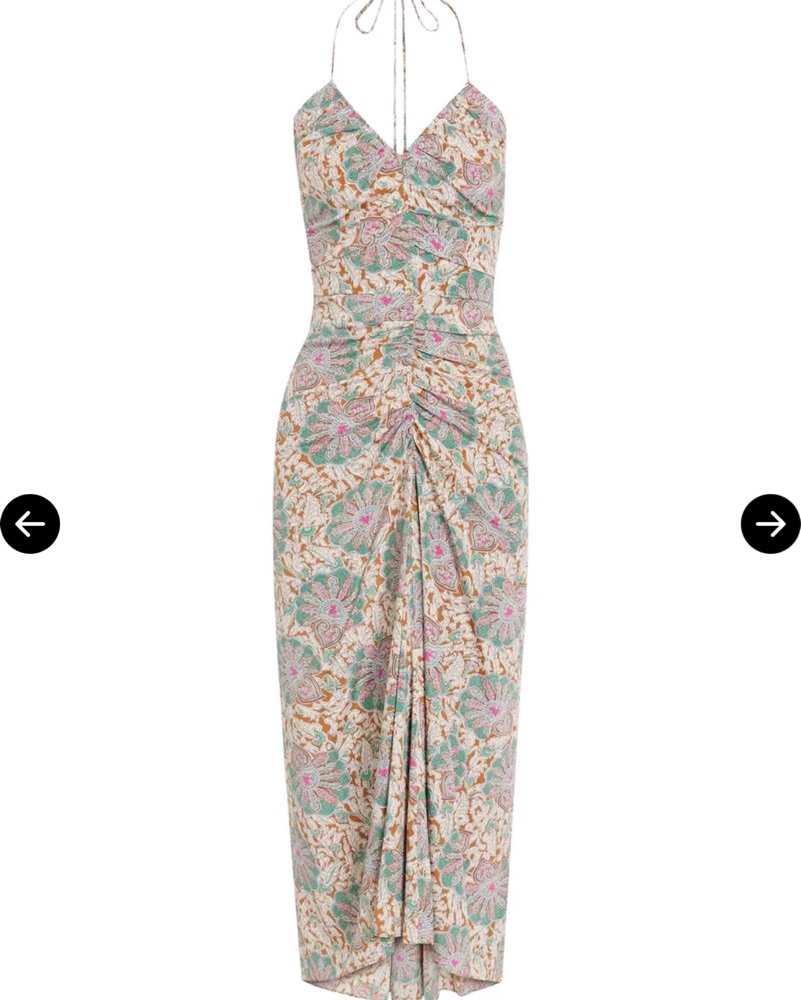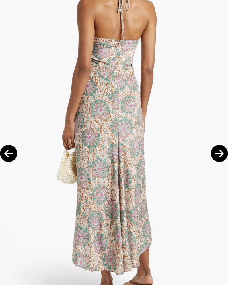 The Veronica Beard Aldana Dress is a paisley-print midi dress with a halterneck. It is crafted from stretch-silk crepe de chine, and features ruched detailing, and ties at the neck. The dress is fully lined with a concealed hook and zip fastening along the back.