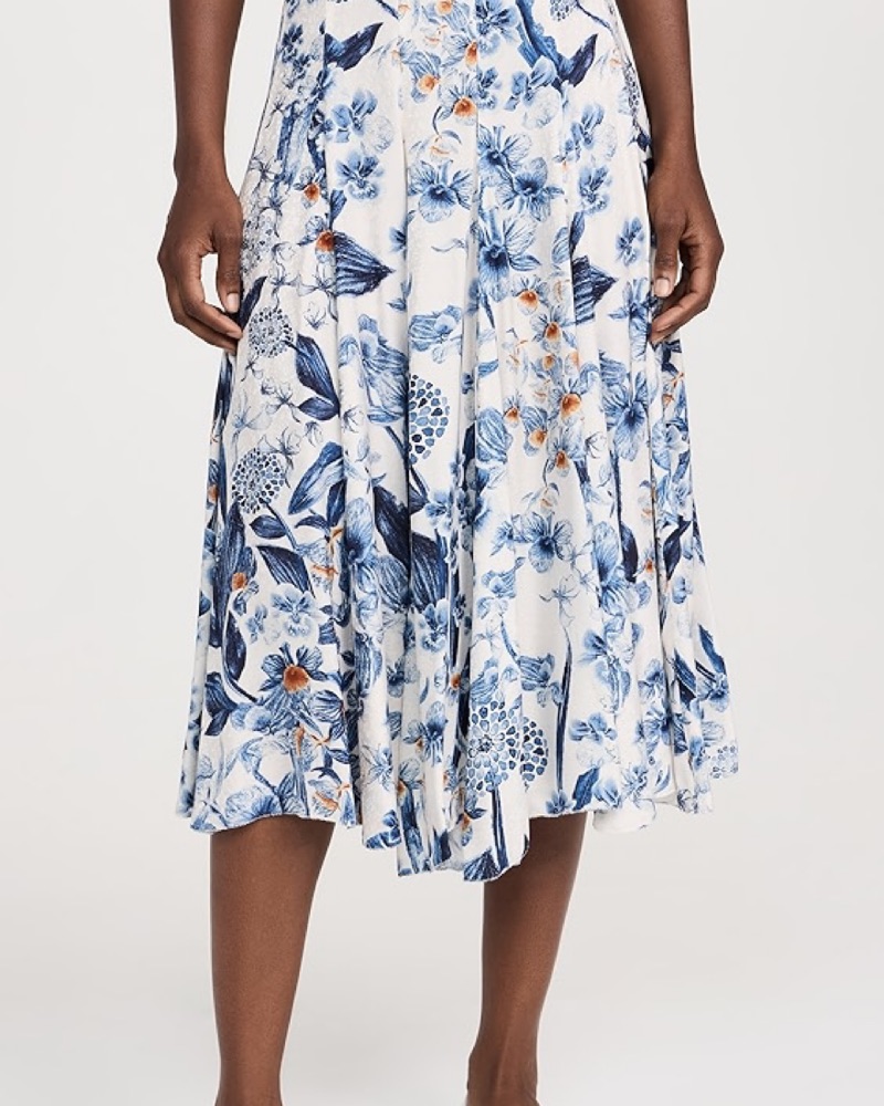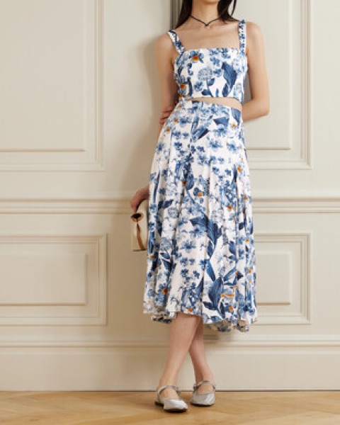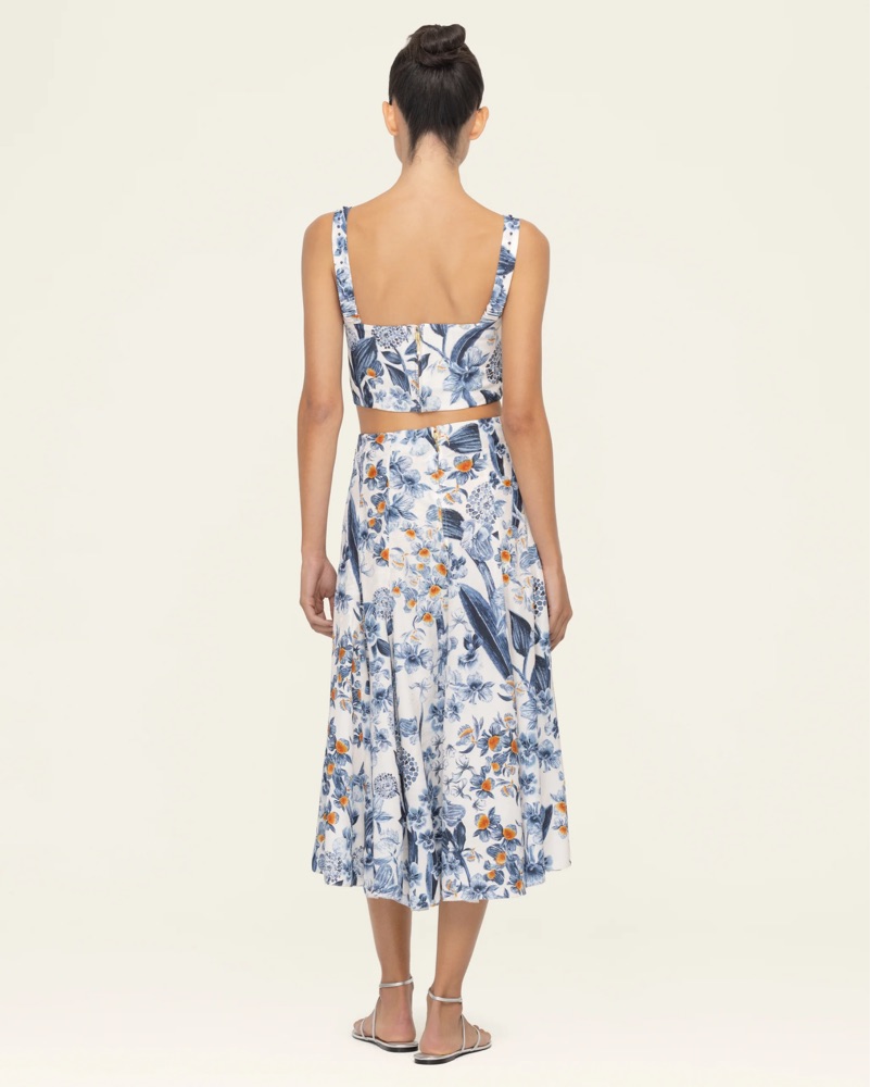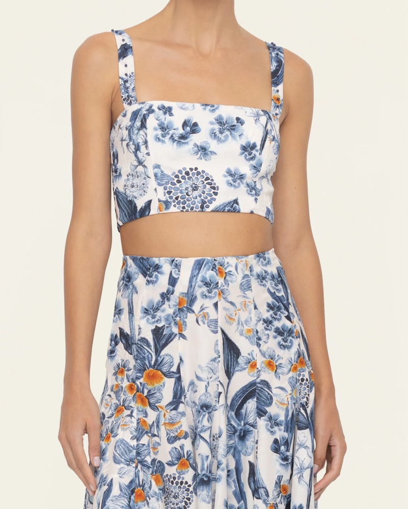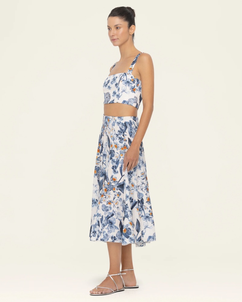Matching skirt and top set from Agua by Agua Bendita. Petalo Mimosa skirt and Petalo Cacao top, both sold out from 2025 collection. Gorgeous floral silky fabric with blue and white print.