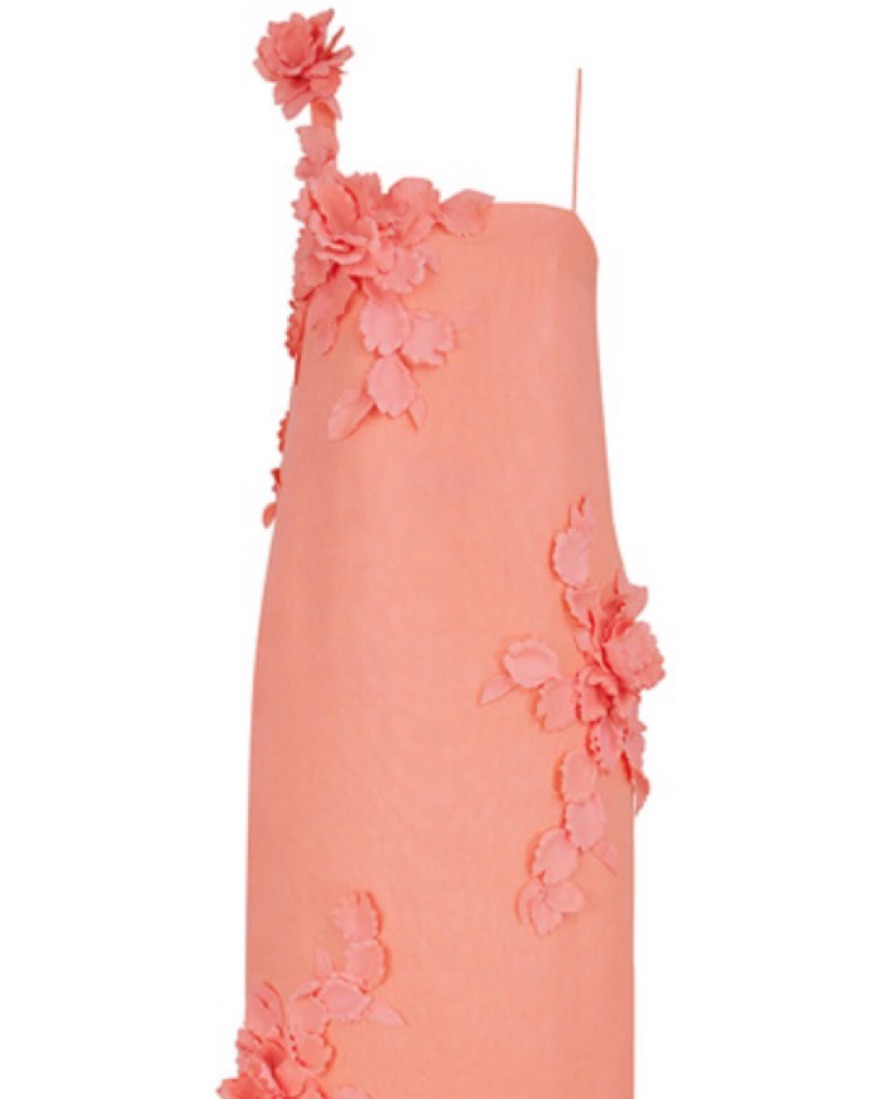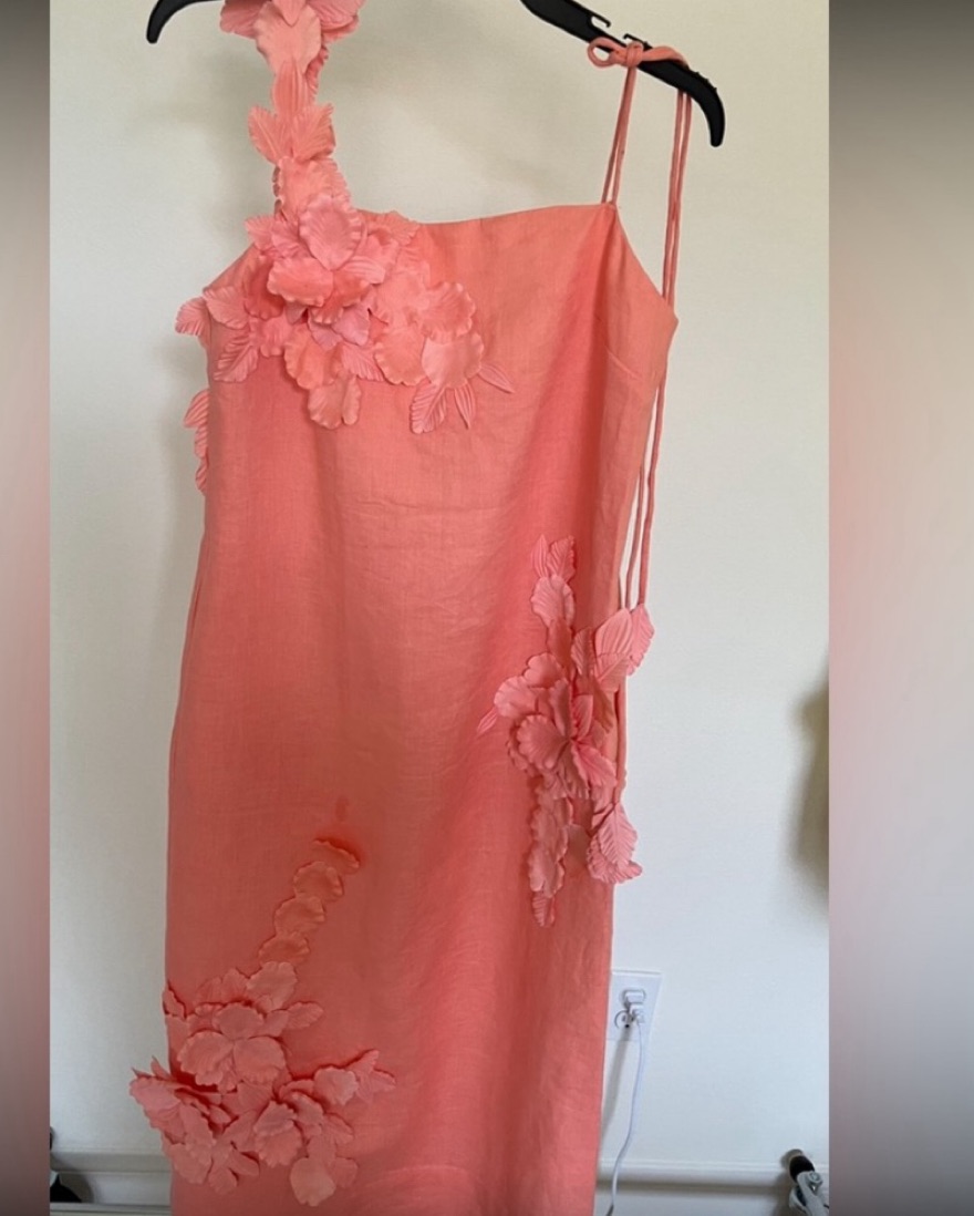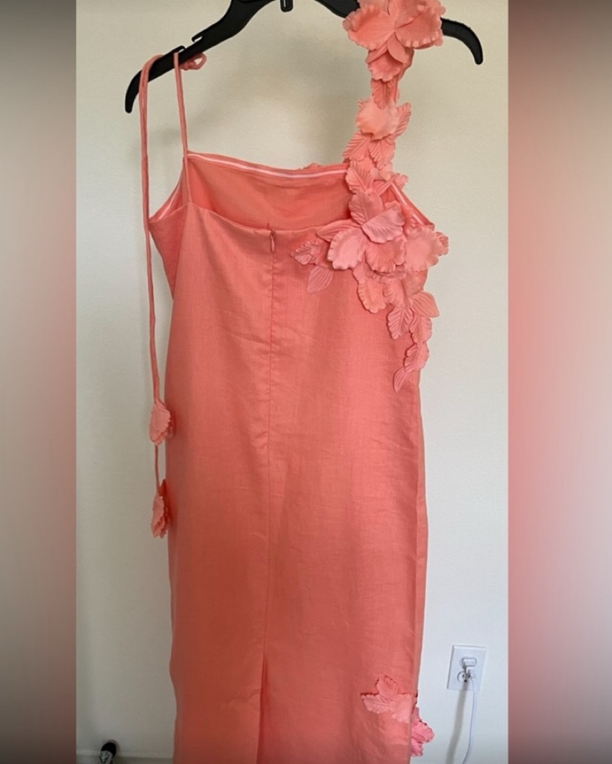 Elevate your style with this stunning one-shoulder dress adorned with intricate floral appliqués. Perfect for a summer soirée or special occasion.