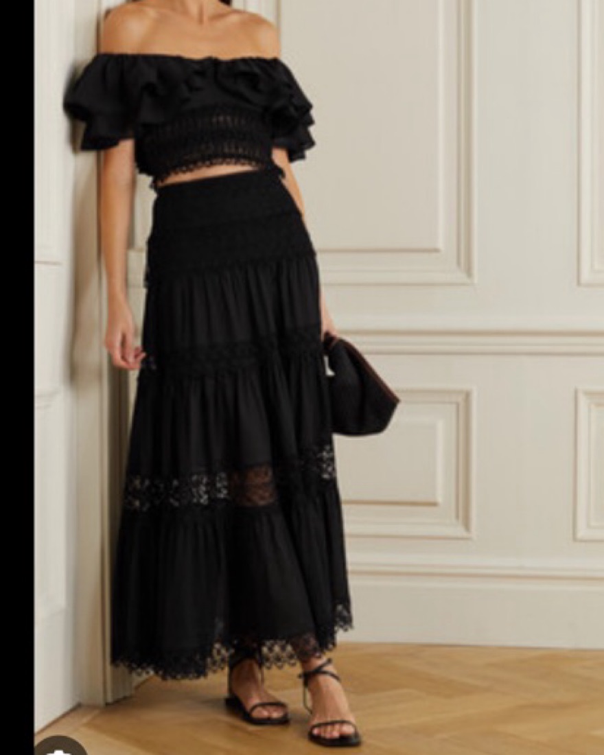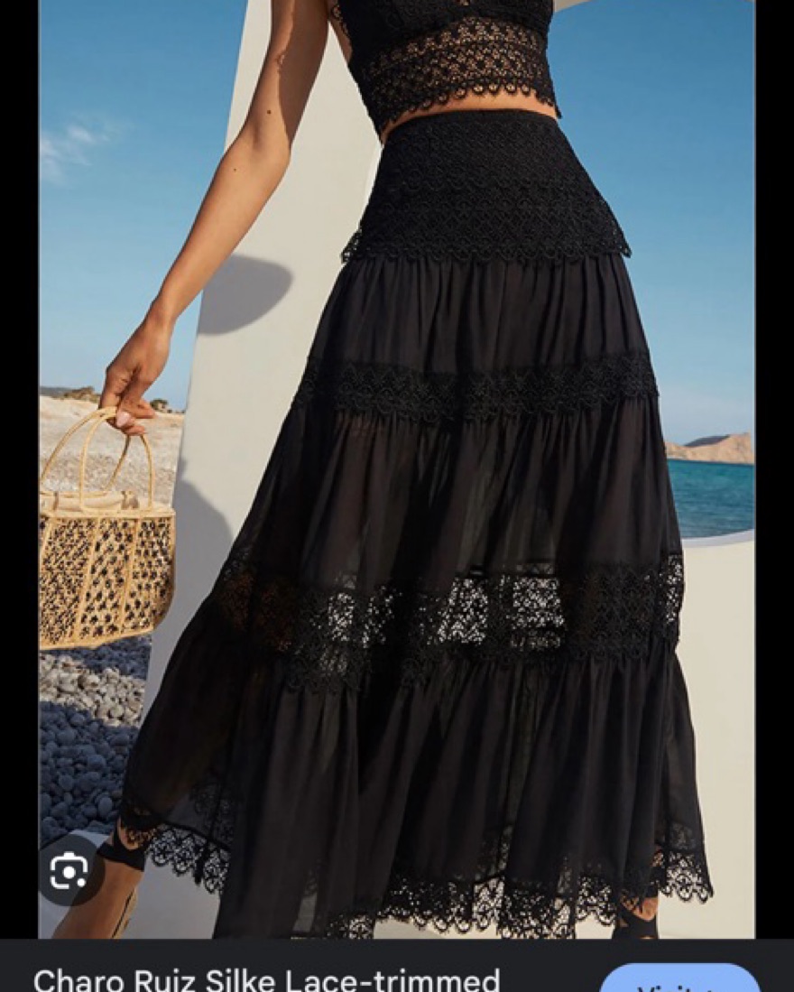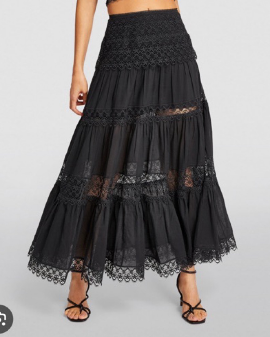 Silk and lace tiered black skirt from charo ruiz ibiza. Super comfortable and chic. Size M but can be wirn skightly low rise on a size S