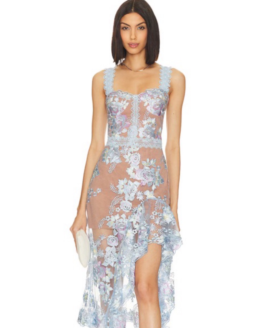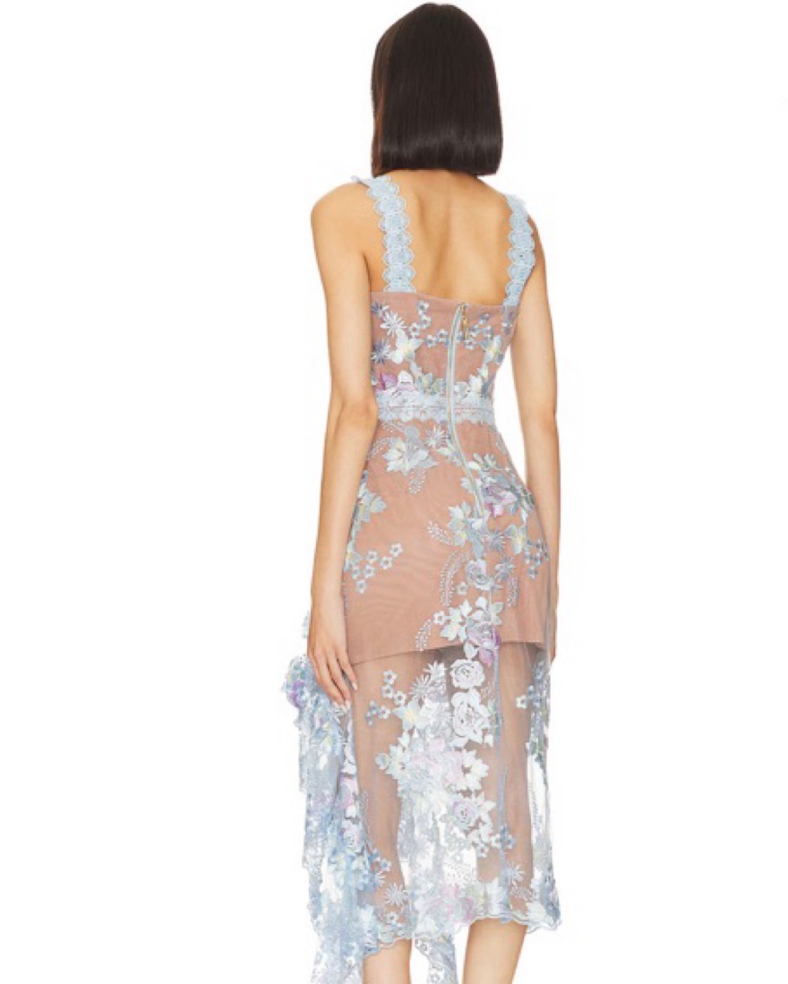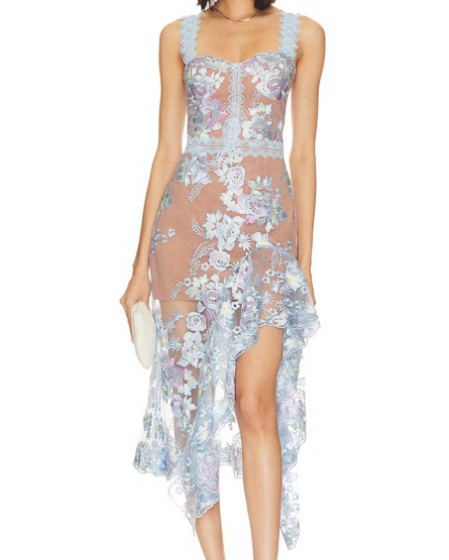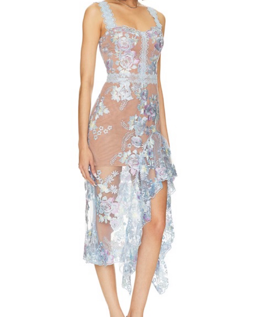 This stunning midi dress features a beautiful floral lace overlay, perfect for a special event or date night.