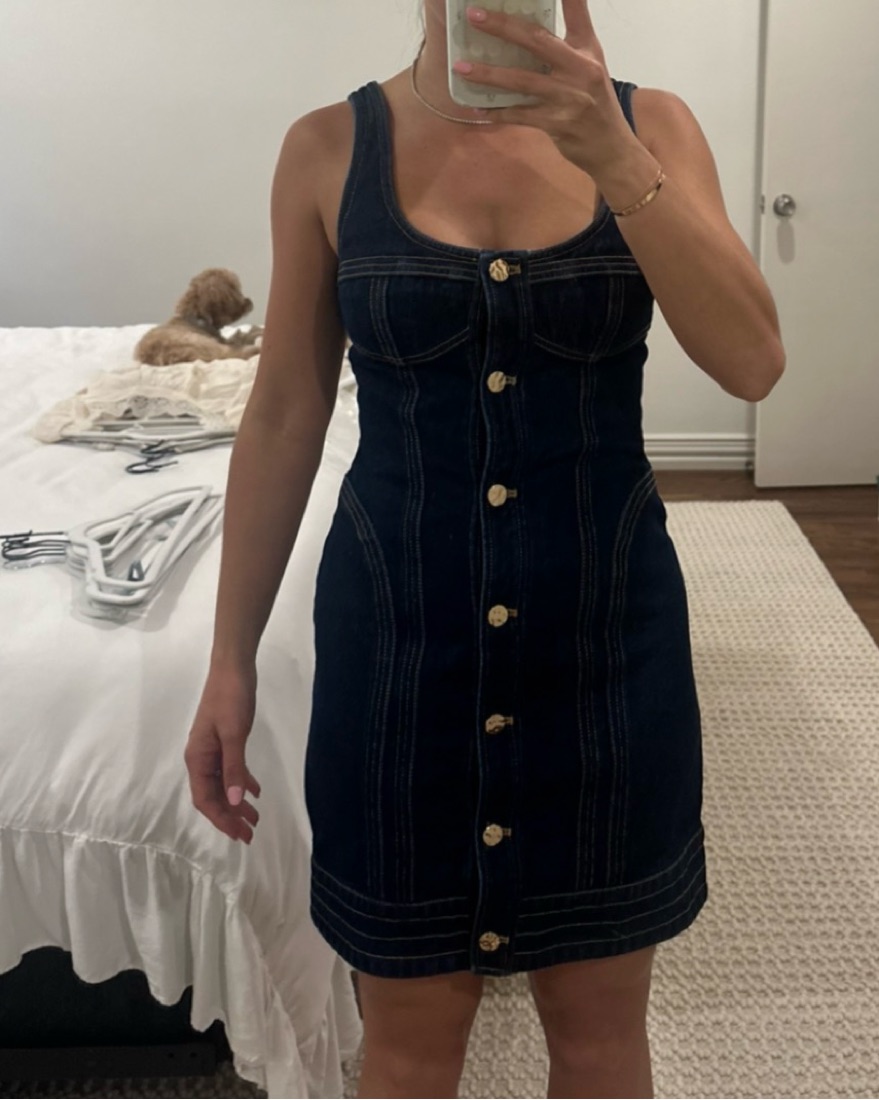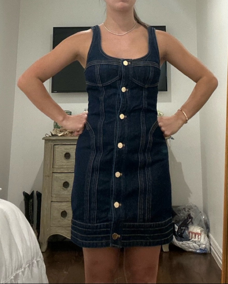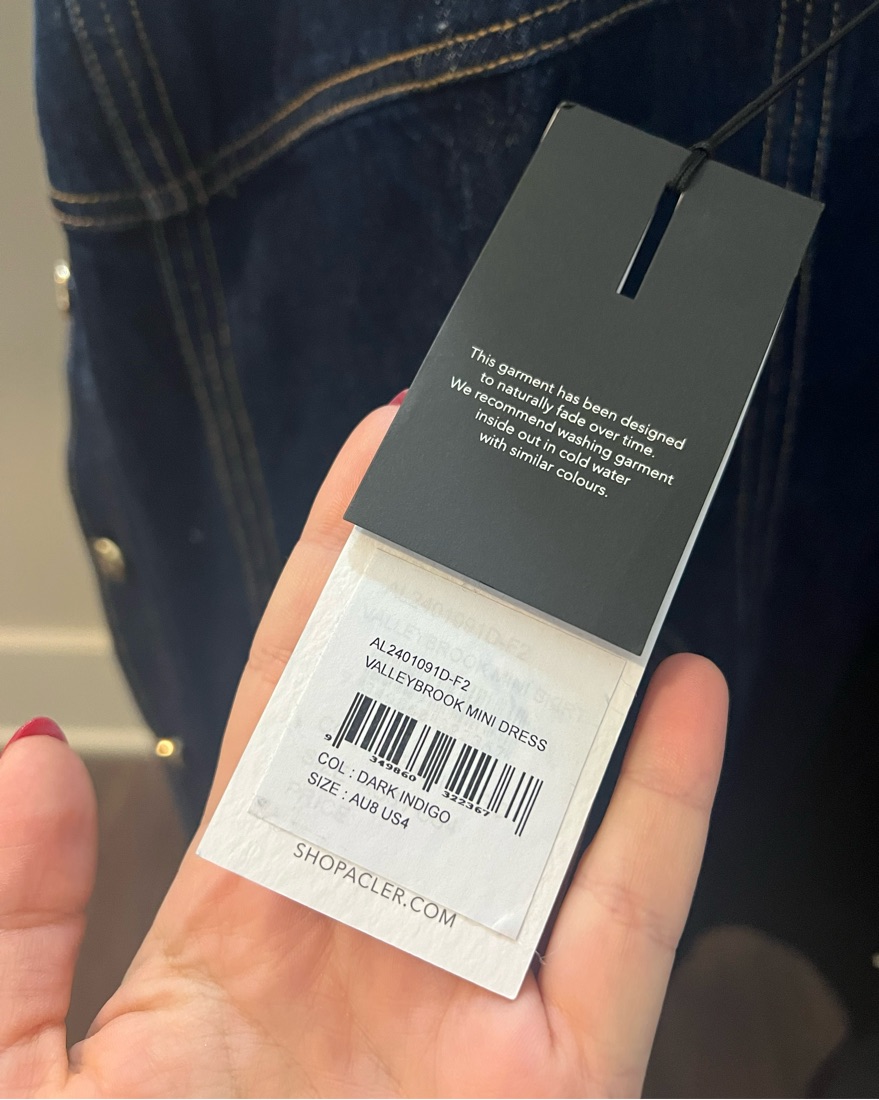Never worn it didn’t fit me right but is SO cute in person!! A little on the longer side but you could so shorten it. Absolutely love just doesn’t fit me right AU8/US 4 brand new with tags!