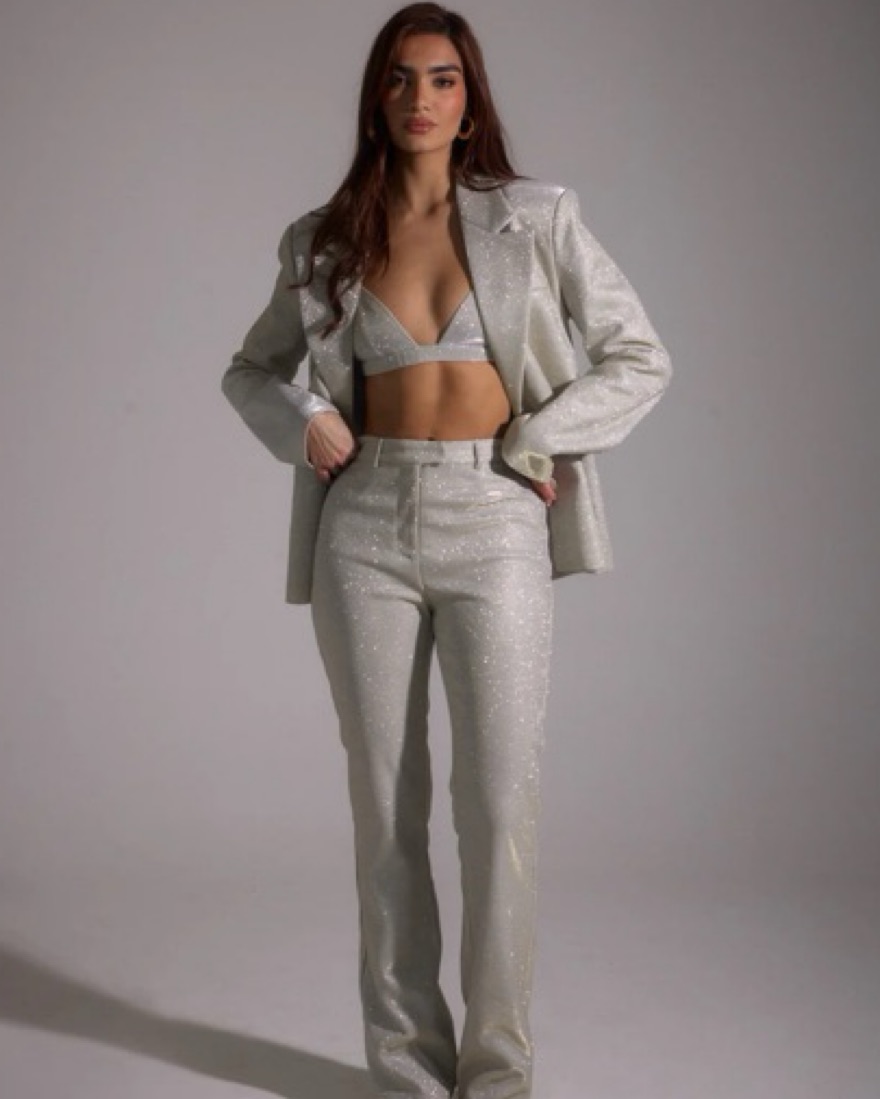 A luxe, high-shine, glitter fabric, tailored suit - bralette, blazer and trousers.