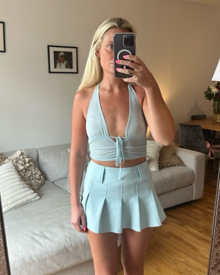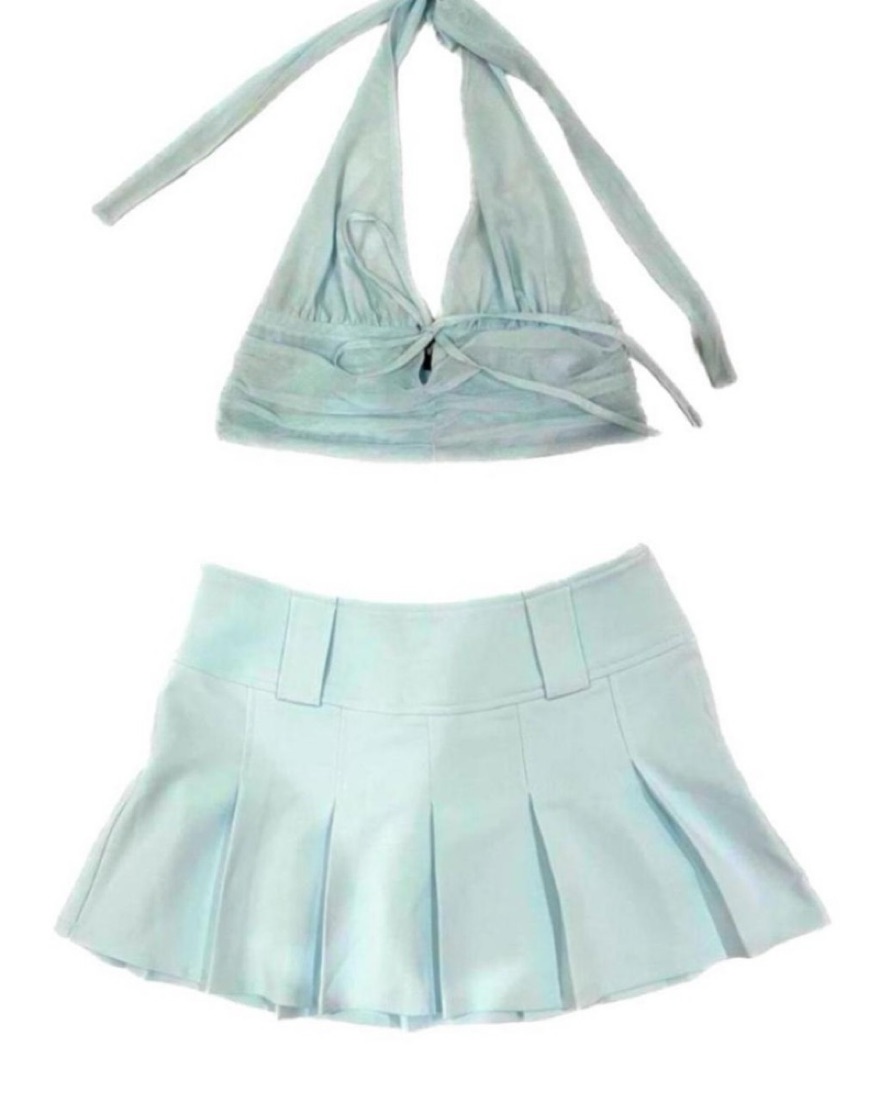 Mesh halter crop top. Skirt has side zipper