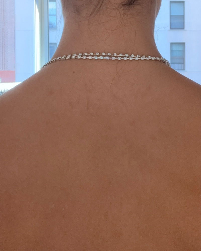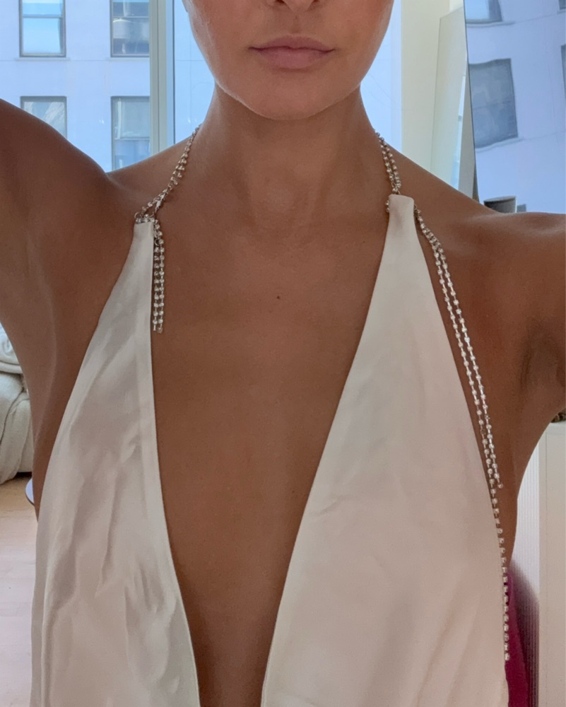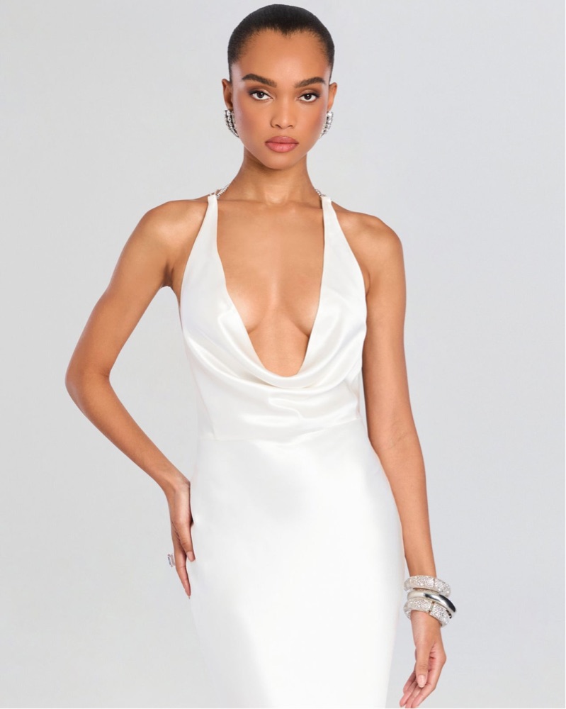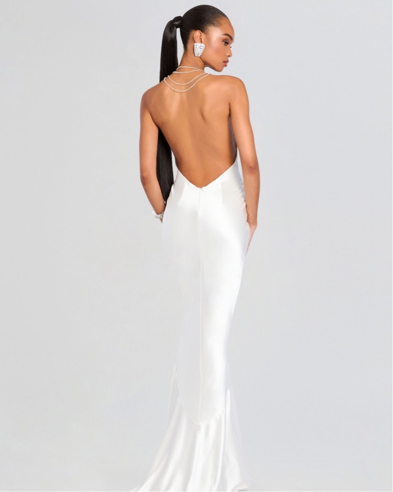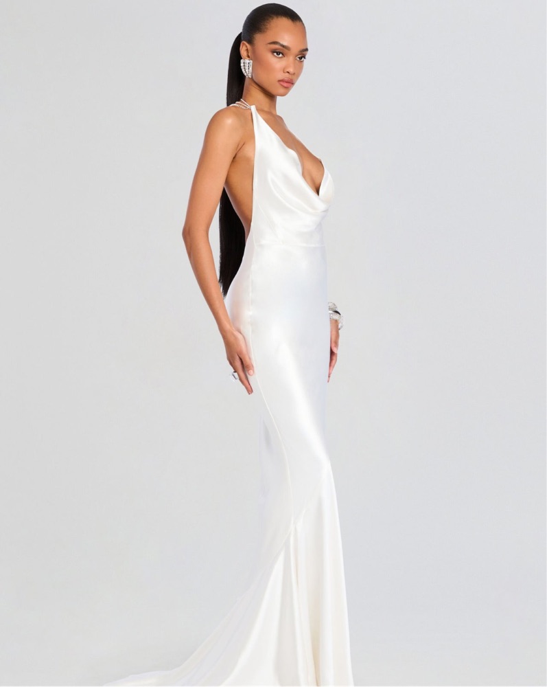 This stunning white satin gown is perfect for a glamorous evening event. The sleek, form-fitting silhouette and deep plunging neckline create a sophisticated, head-turning look.