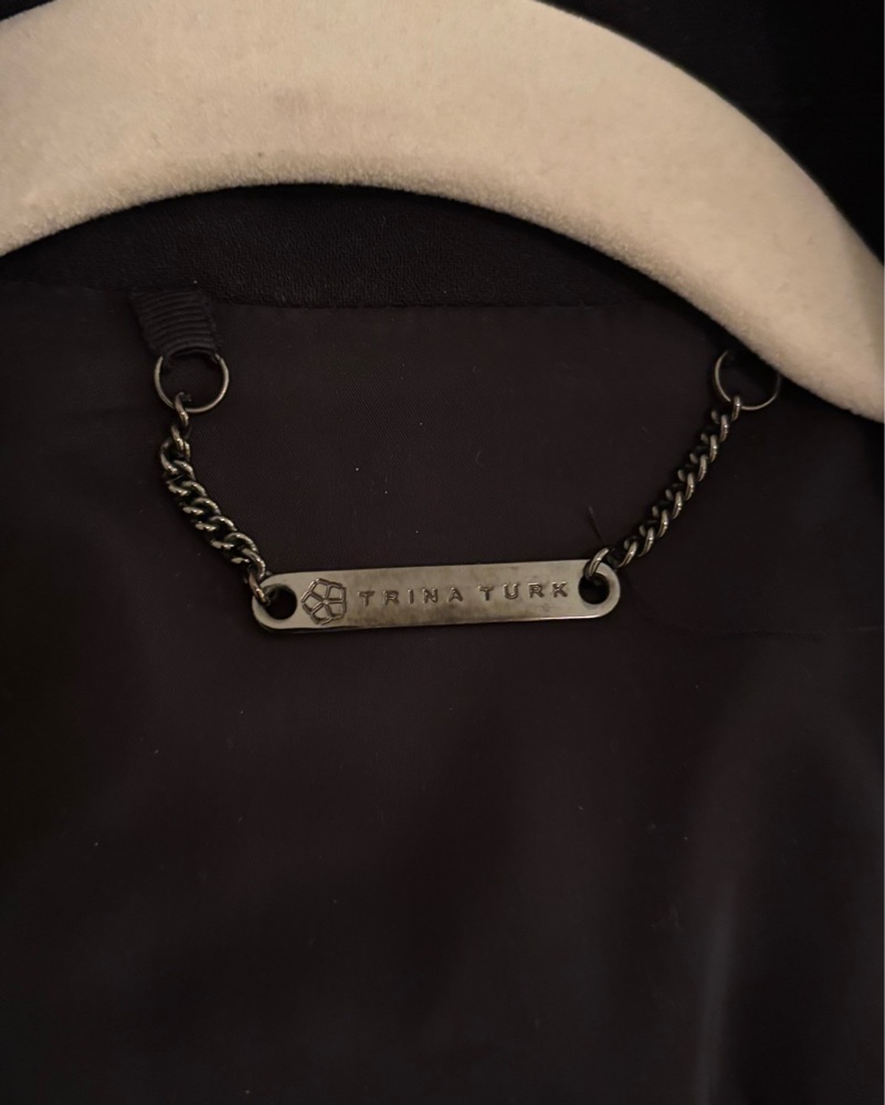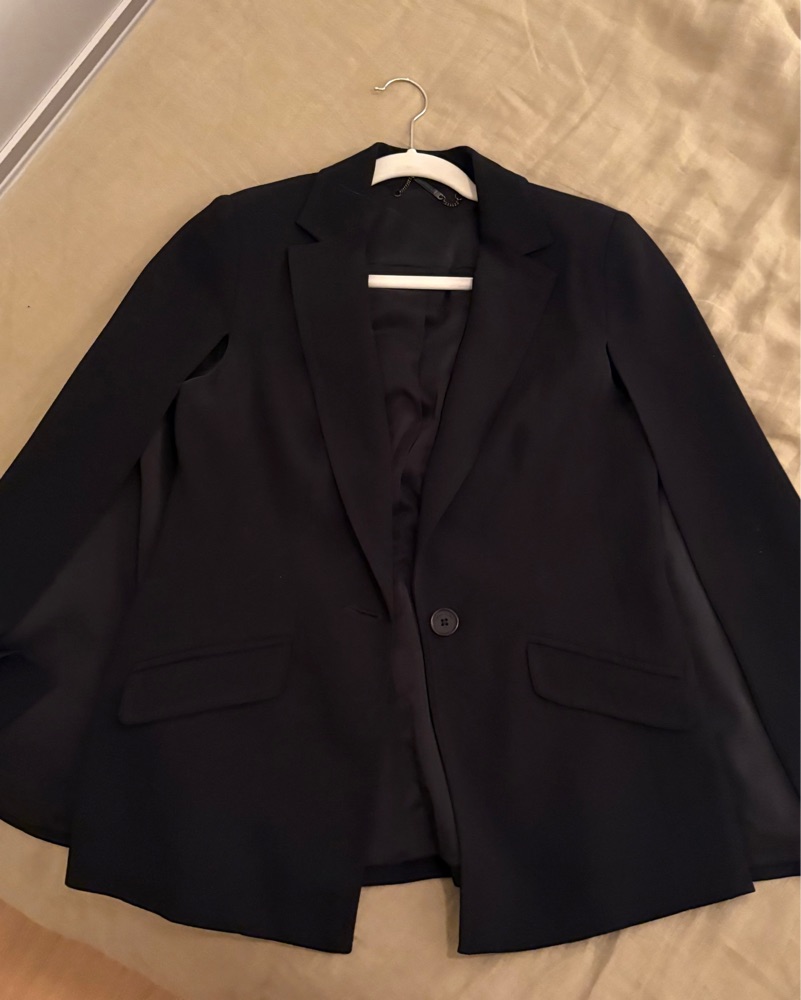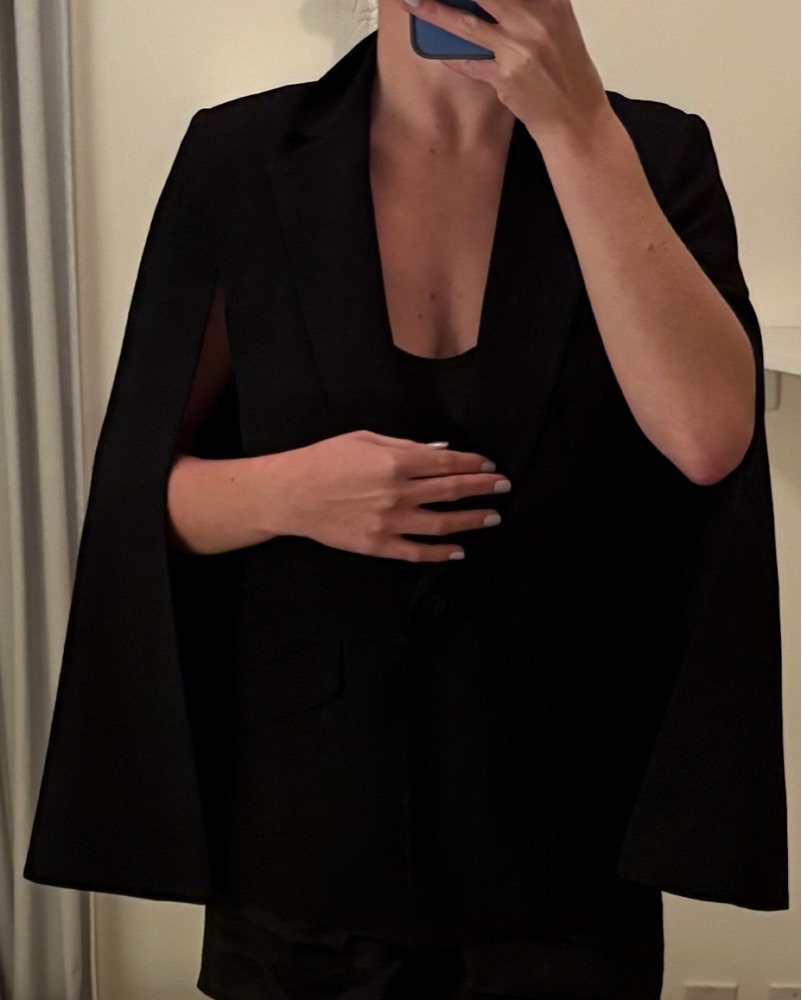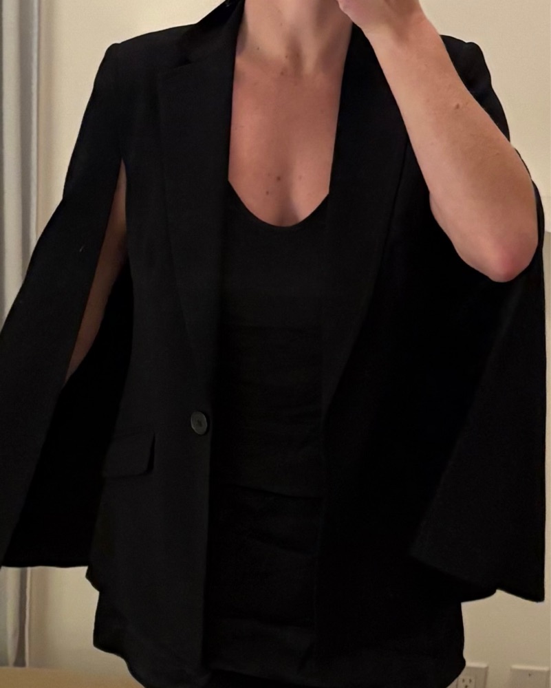 Black cape blazer by Trina Turk —> perfect for a chic work outfit or festive holiday party or with micro shorts