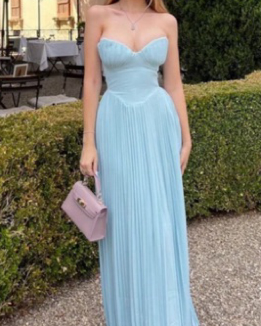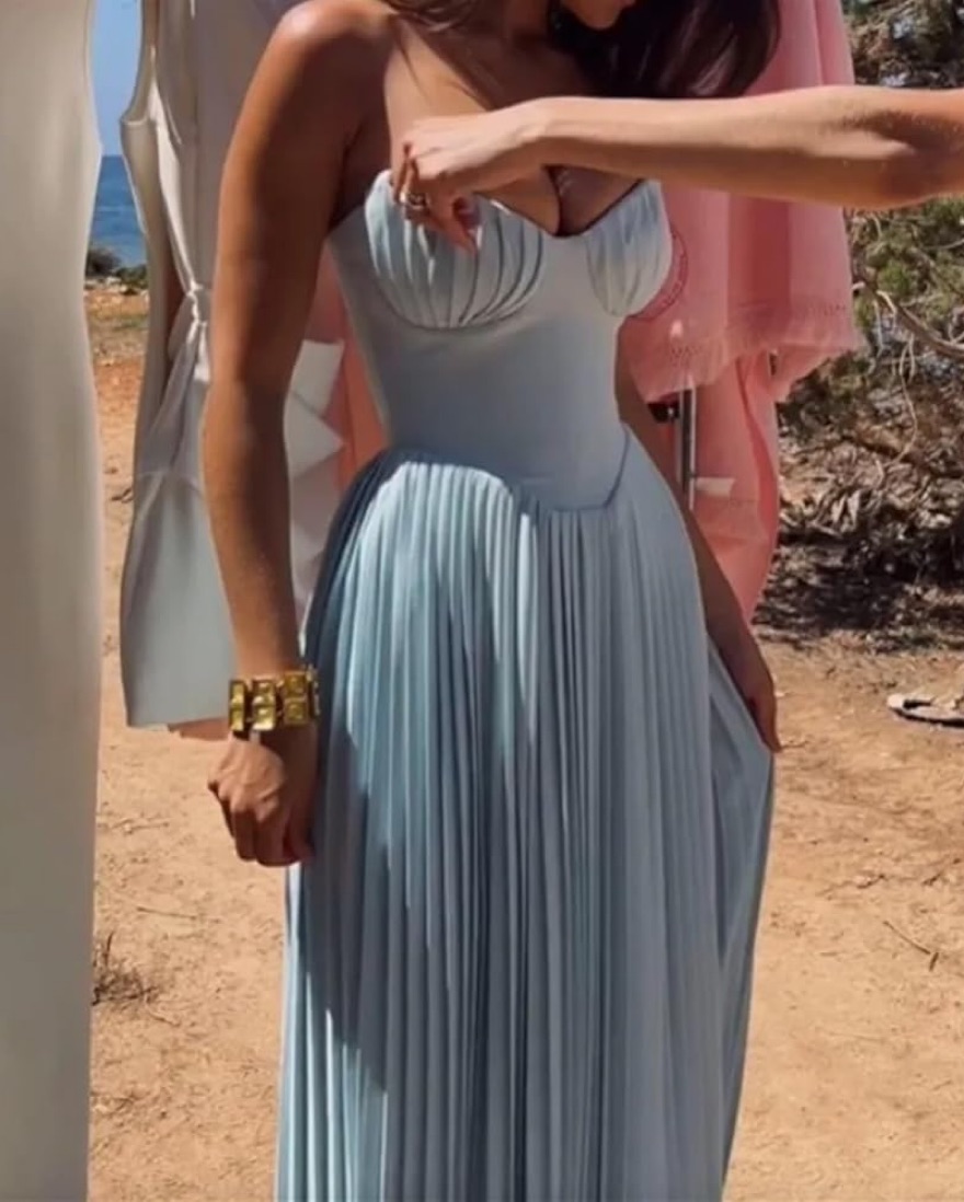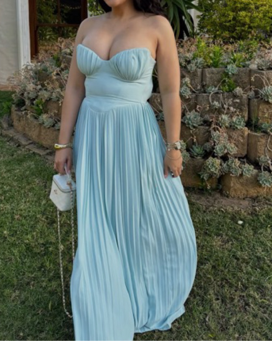 This stunning pleated maxi dress is perfect for any formal occasion. The soft, flowing silhouette and elegant bodice make it a showstopping choice.