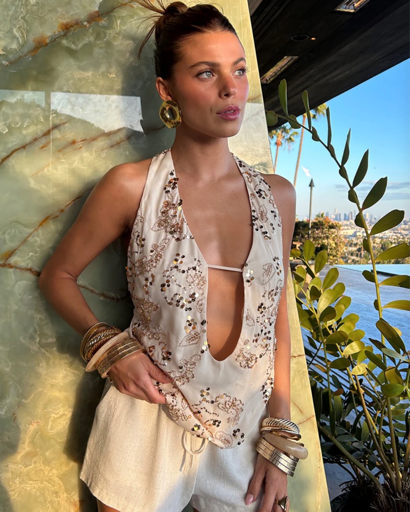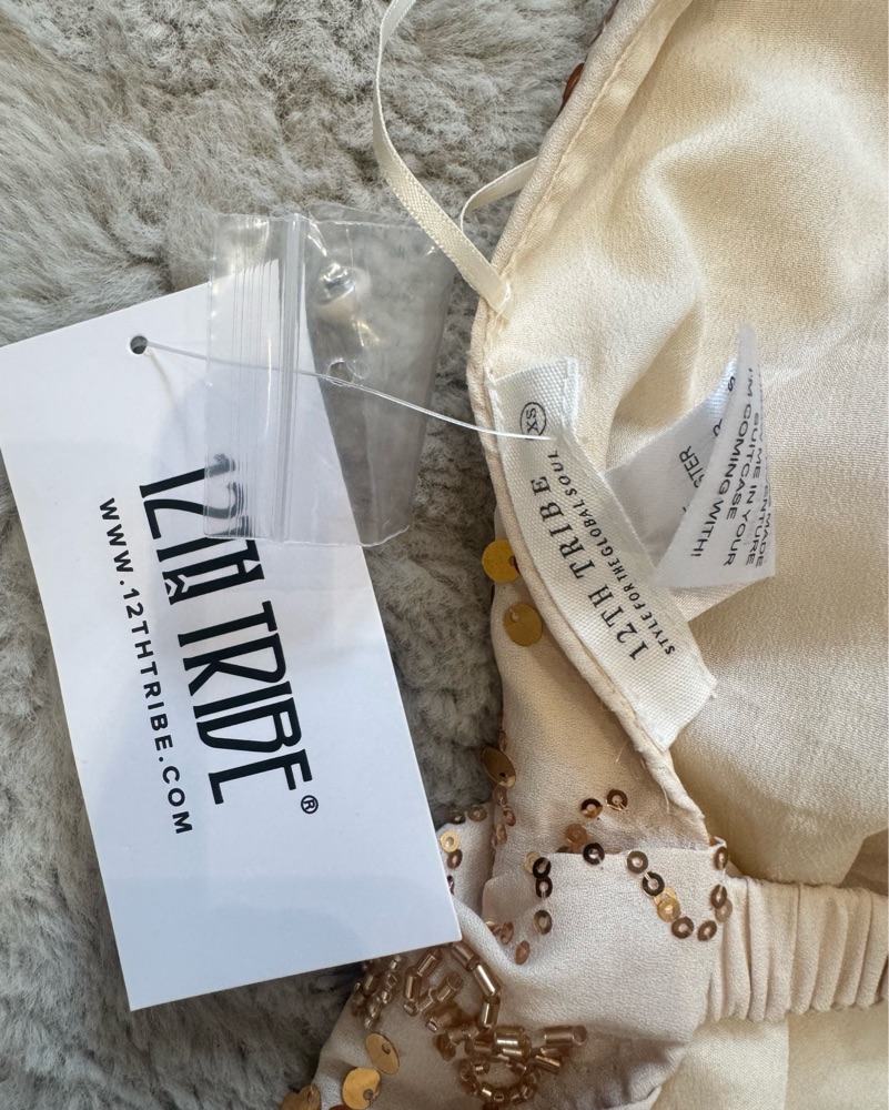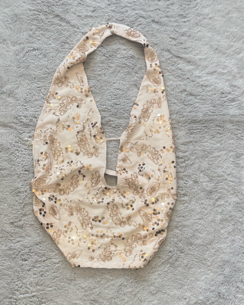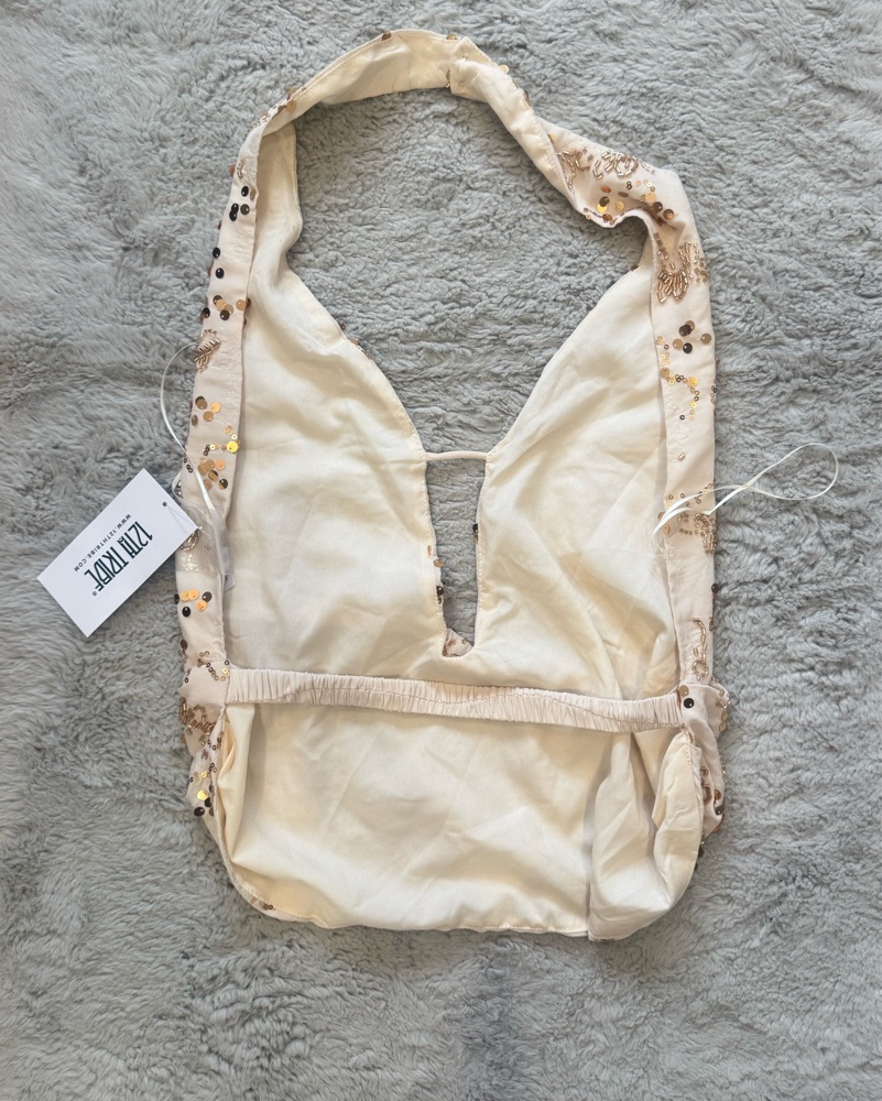 Sexy and fun ivory halter top with open back with gold sequin pattern. Fun and flattering for night out or concert! Unworn with tags.