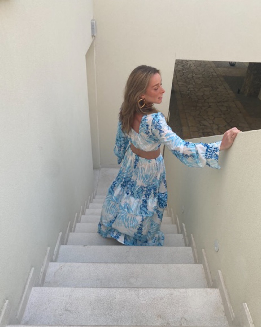 Baby blue, white, navy maxi dress. Long, flowy sleeves and ruffle hem. Deep V in the front, cutouts on the sides, and open back. Great for vacation or dinner in warmer temperatures!