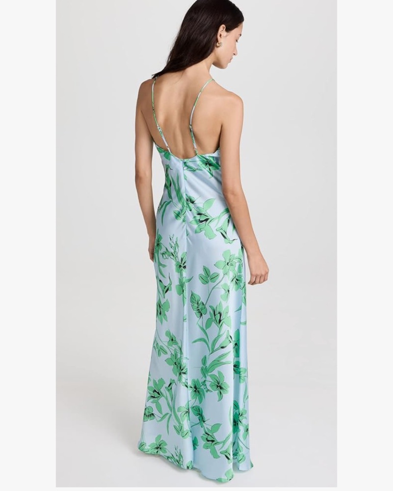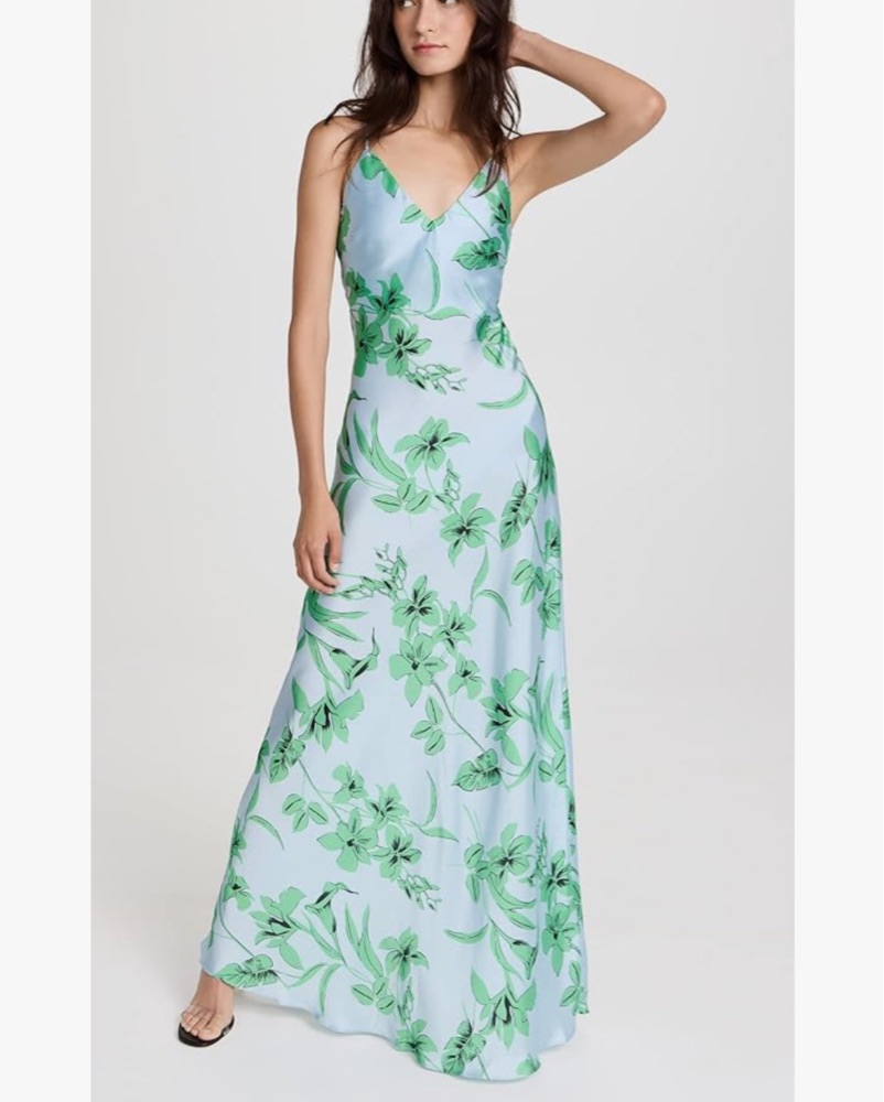 Super cute blue and green floral gown. Great for weddings/summer events! Dress has adjustable straps so fits a variety of heights. This item lives in CA so will ship from there!