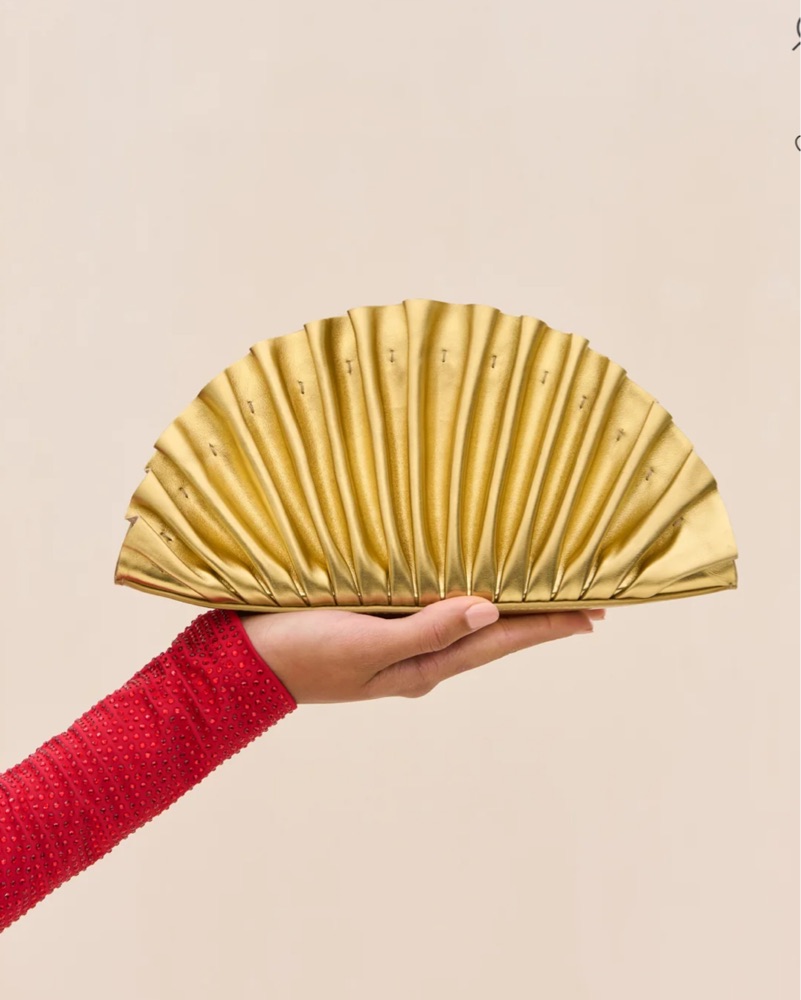 the Nala Mini Clutch is a fanned-style clutch created by pleating luxuriously soft metallic-hued smooth napa leather. The shell shaped silhouette comes in an eye-catching shiny Gold and an invisible magnetic closure keeps all of the essentials safe.