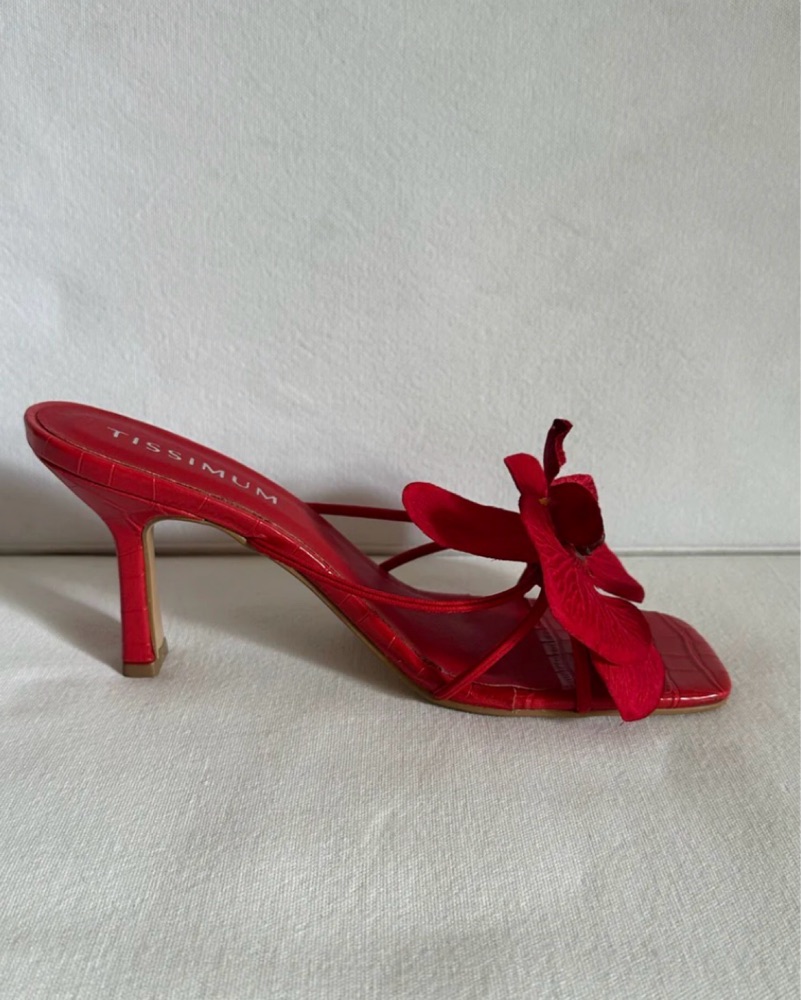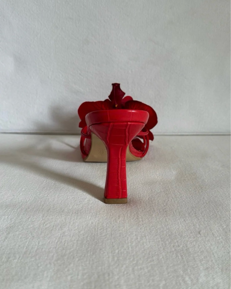 These stunning red sandals feature a delicate floral accent, perfect for adding a touch of feminine flair to your look. Suitable for a variety of occasions, from a formal event to a night out on the town.