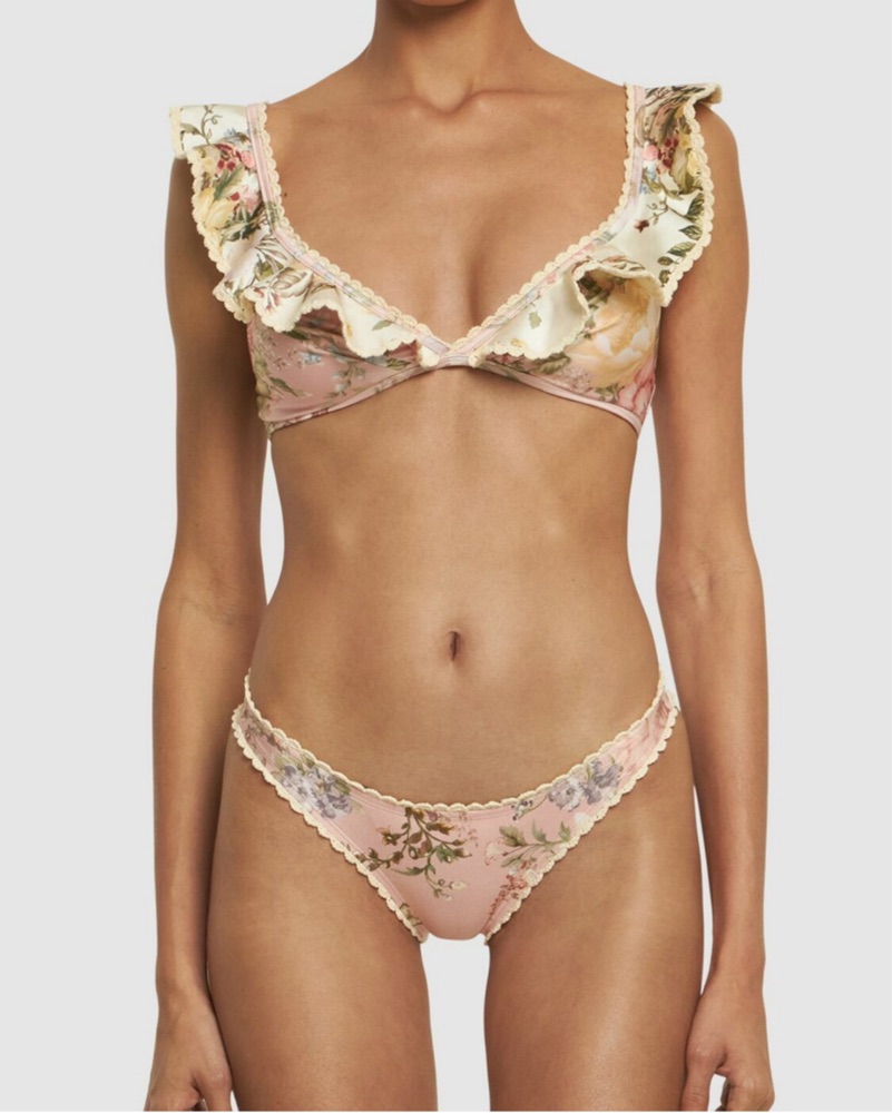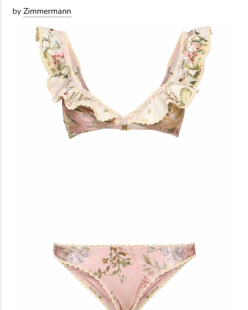This Zimmermann delicate and romantic floral bikini set is perfect for a relaxed beach day or a poolside getaway. The ruffled lace trims add a touch of feminine charm.
