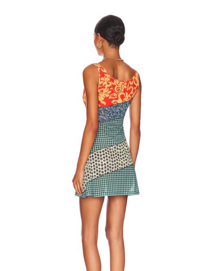 Miaou x Paloma Elsesser Ginger Dress in Sweet Legend. Super cute mini dress for vacation, summer, bachelorettes, etc. It’s a lightweight flowy semi-sheer mesh fabric with colorblock and floral design and unlined so I’d recommend a nude undergarment or shapewear underneath for bottoms!