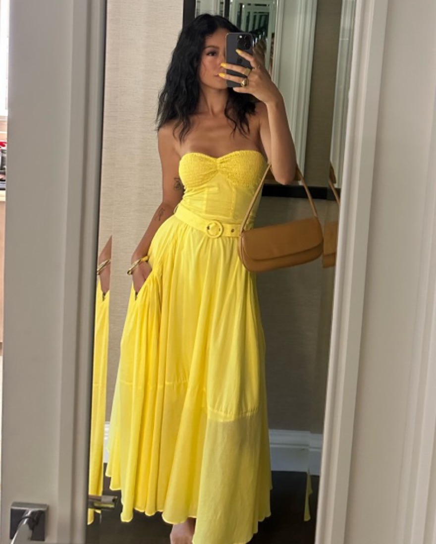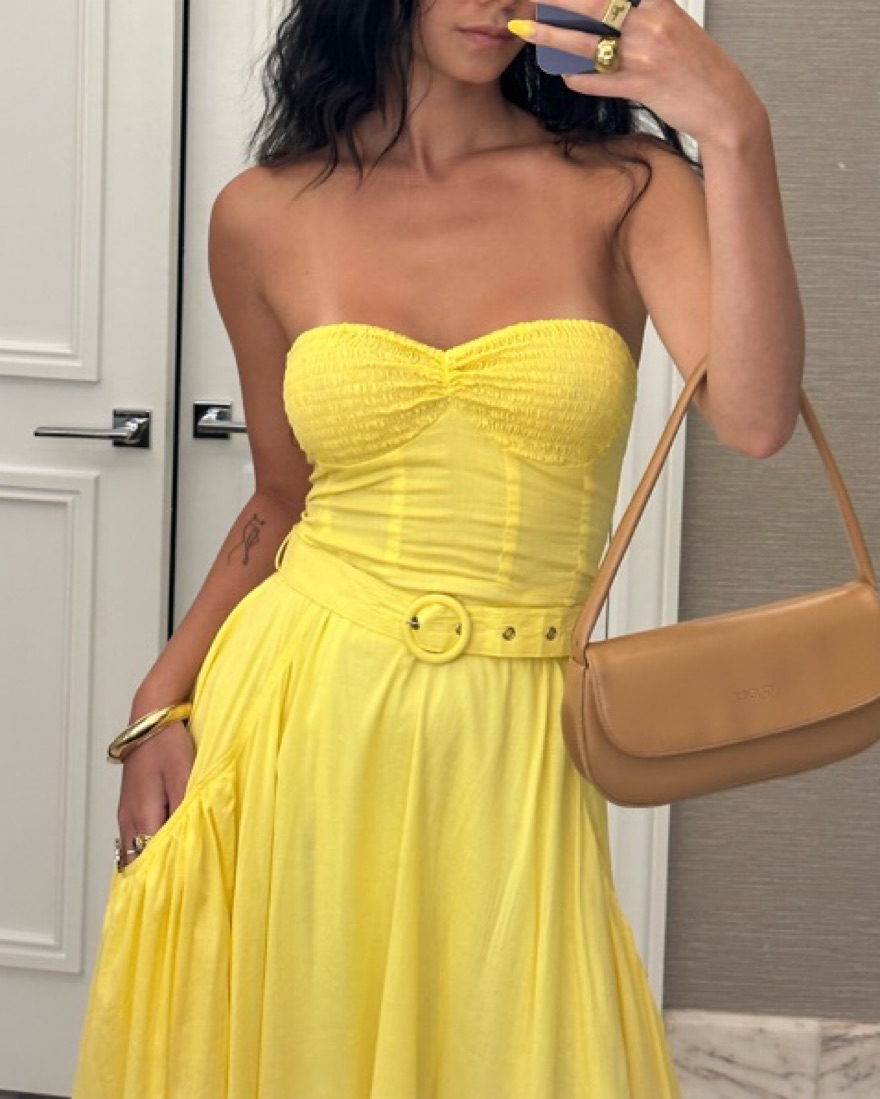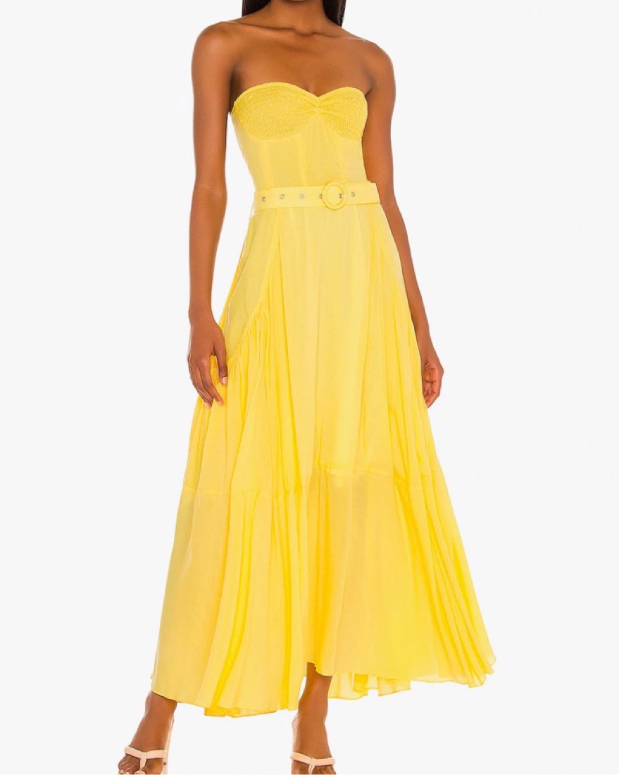 Brand is SWF on Revolve. Features ruching through the bodice and sweetheart neckline. The skirt is soo flowy and amazing for movement. Belt is adjustable and can be removed.