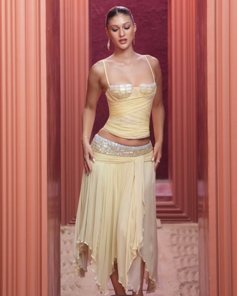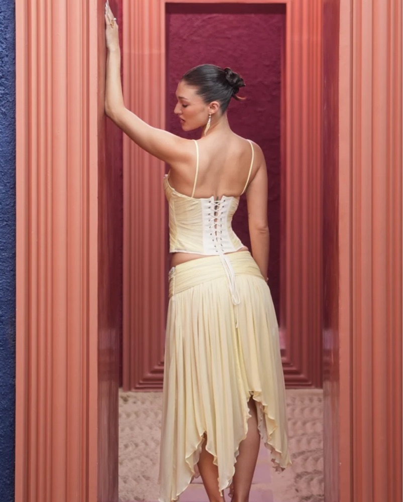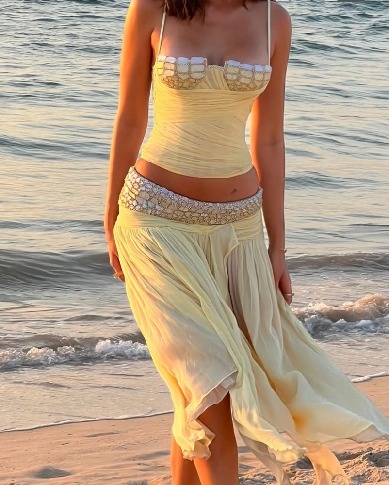 Corset and skirt and both size small- please see size chart in last photo. Please be cautious of beading around waist when zipping. No stretch to material