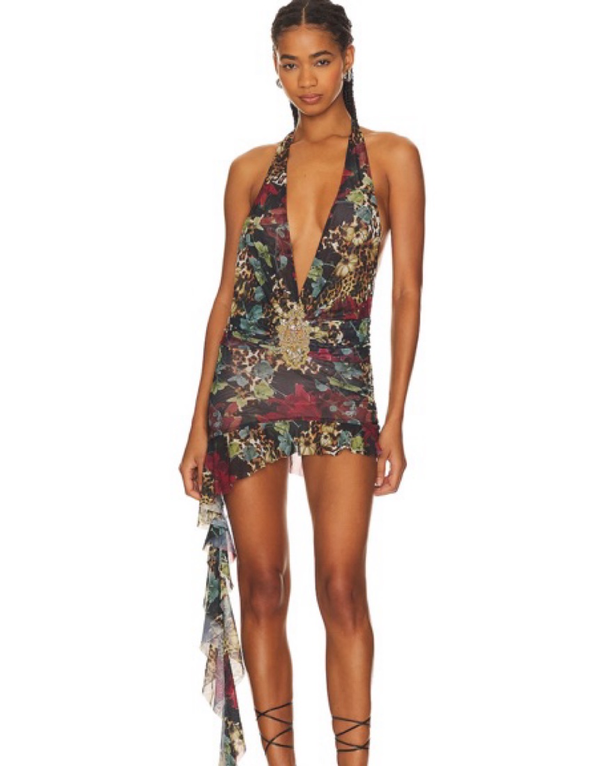 This stunning halter-style dress features a bold floral print that is perfect for a summer night out. The deep-V neckline and high-rise waist create a flattering silhouette.