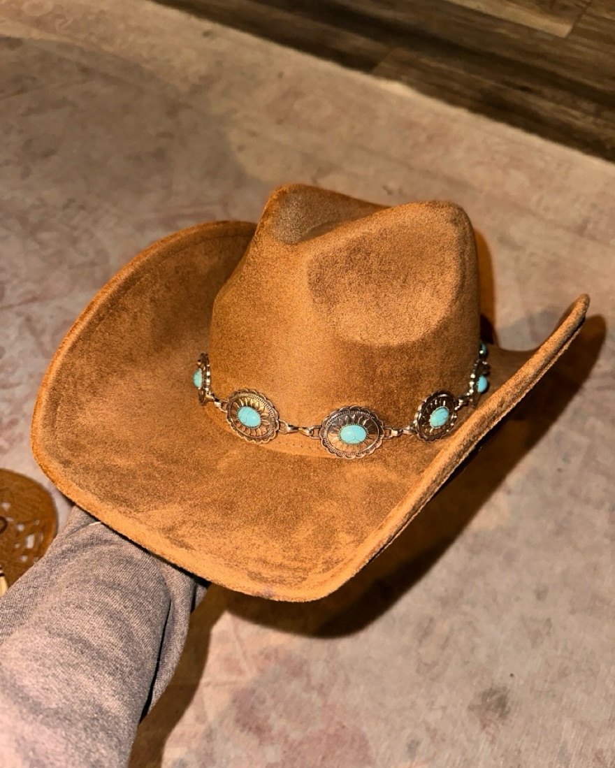 Concho western belt with turquoise stones and matching brown hat . Perfect for stagecoach, festival, Coachella, concerts, and western wear