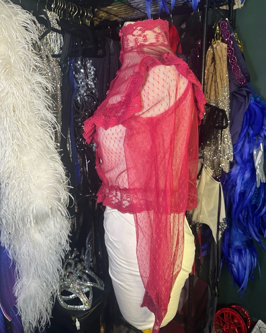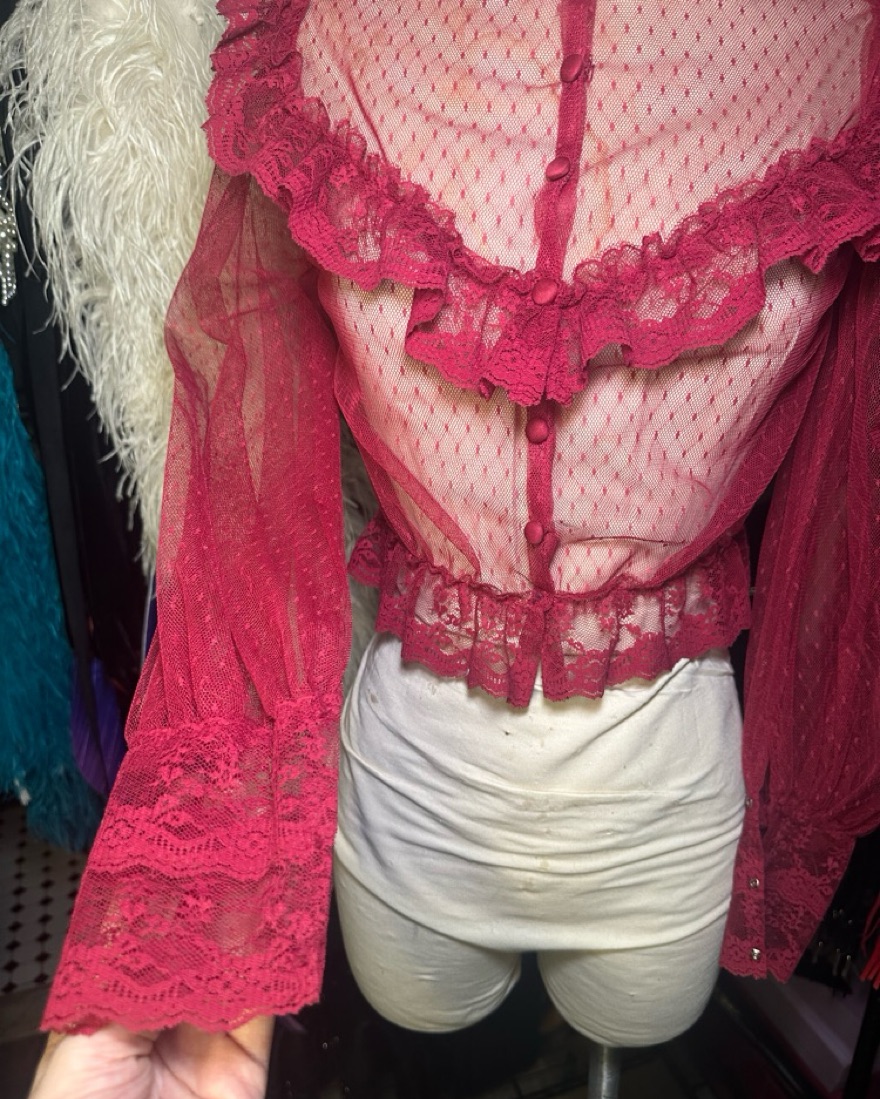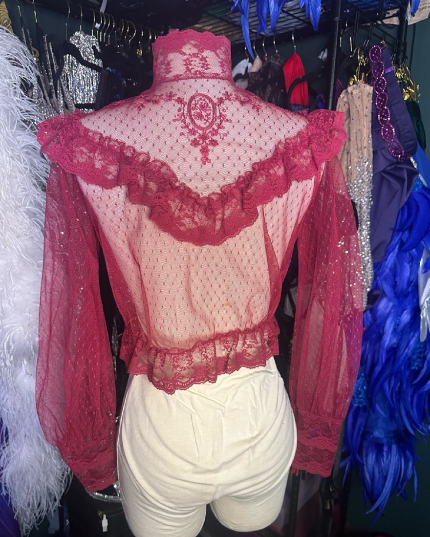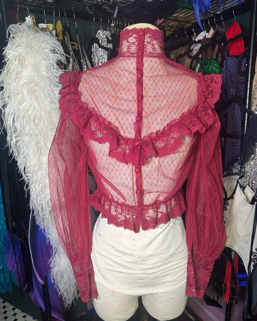 This Victorian-inspired burgundy lace blouse features sheer lace, ruffled details, delicate buttons, and a high neck. Perfect for performances, photoshoots, or vintage-inspired styling, it’s ideal for formal events or costumes. Condition: Excellent. A timeless addition to any wardrobe!
