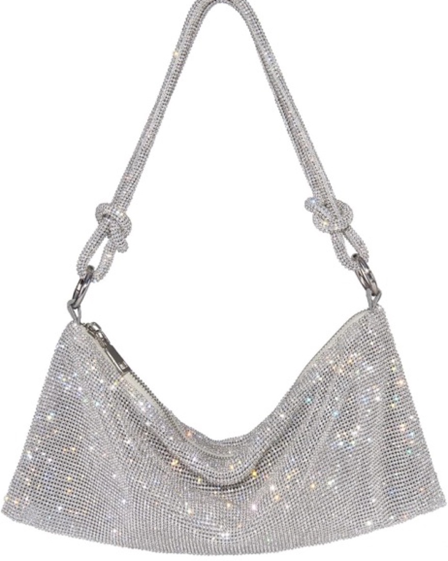 Cult Gaia Silver Sparkle Purse Dupe - This rhinestone evening bag is perfect for parties, weddings, date nights, or nights out on the town. This silver purse is chic and unique with its chic metal zip closure, detachable shoulder strap and full of sparkling crystal rhinestones. 🤍
