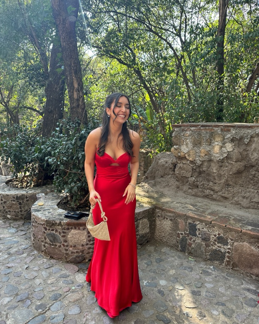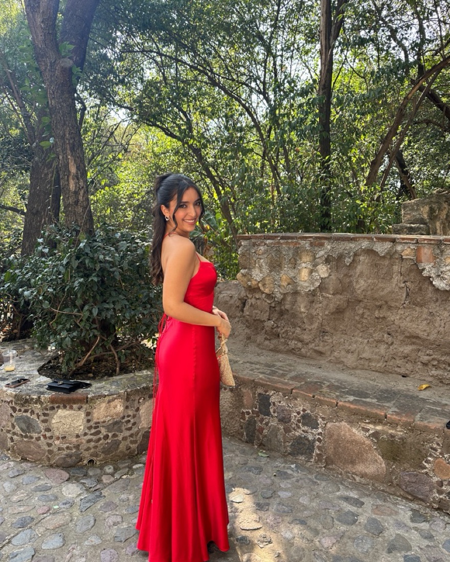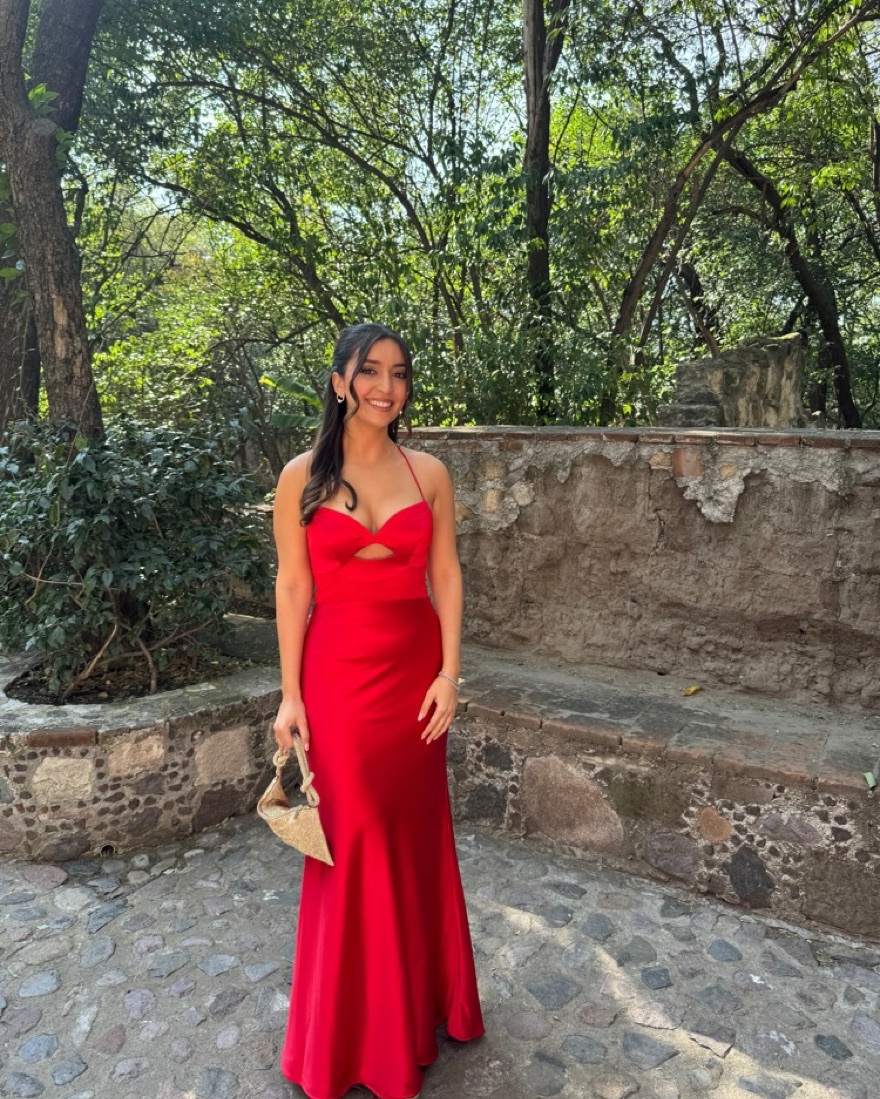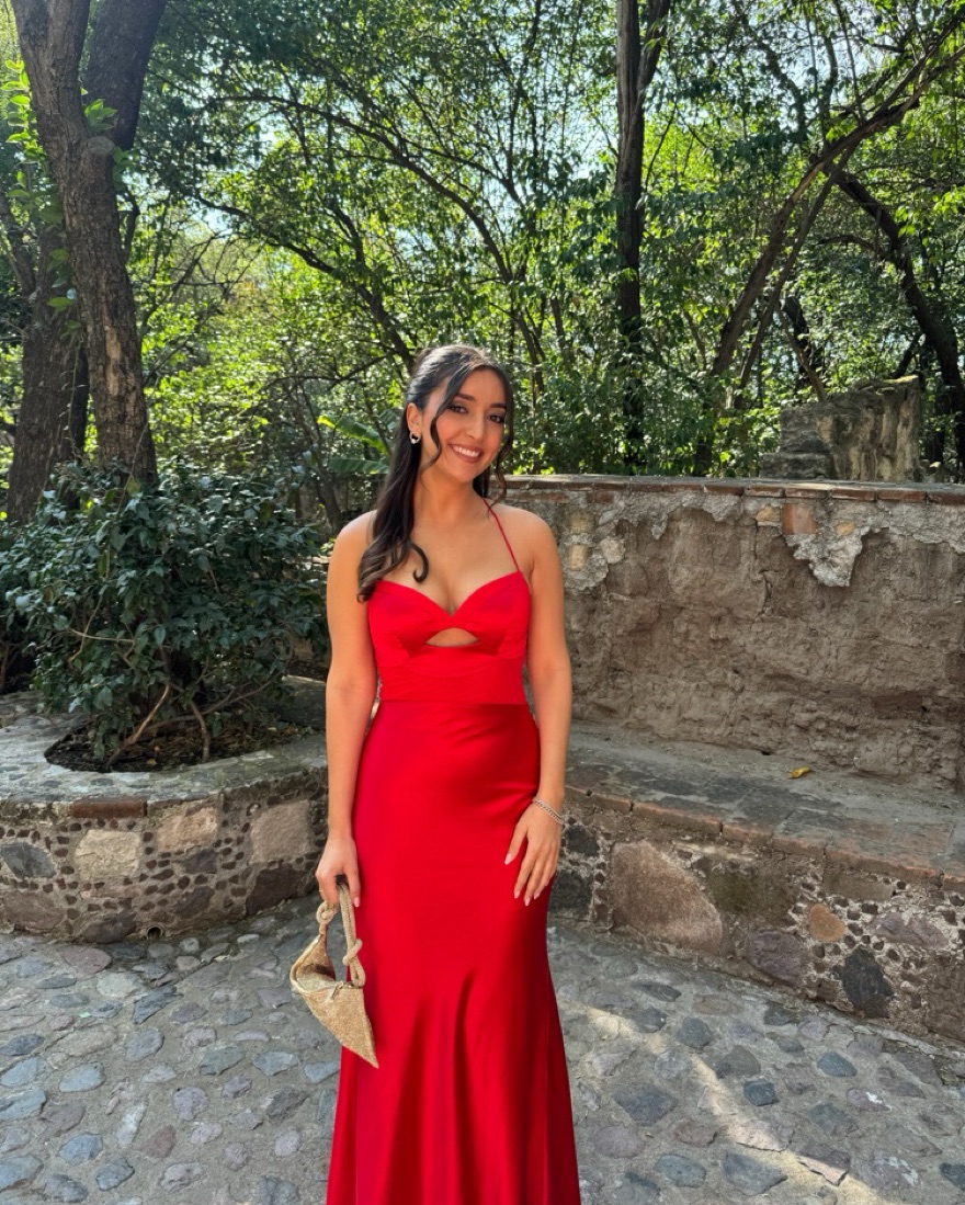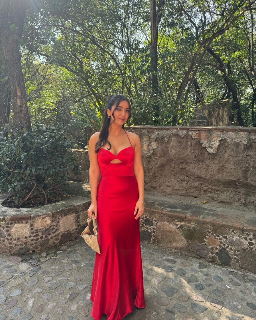This red floor-length gown is the perfect dress for any classy event. Great as a wedding guest, red carpet, party, etc. The dress ties in the back around the neck. It’s super comfortable and flattering. Hold the girls up nicely ;)