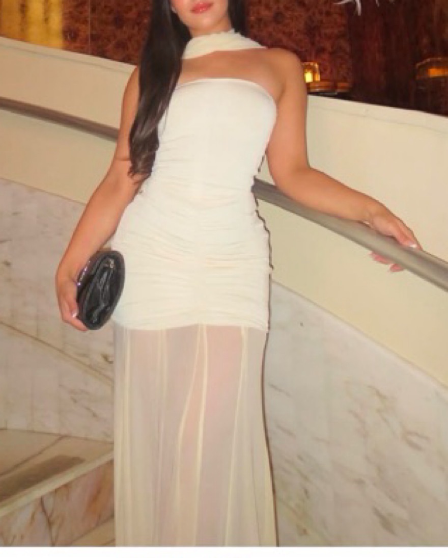 This stunning white maxi dress is perfect for a formal event or special occasion. The flowing, sheer overlay adds a touch of elegance and sophistication.