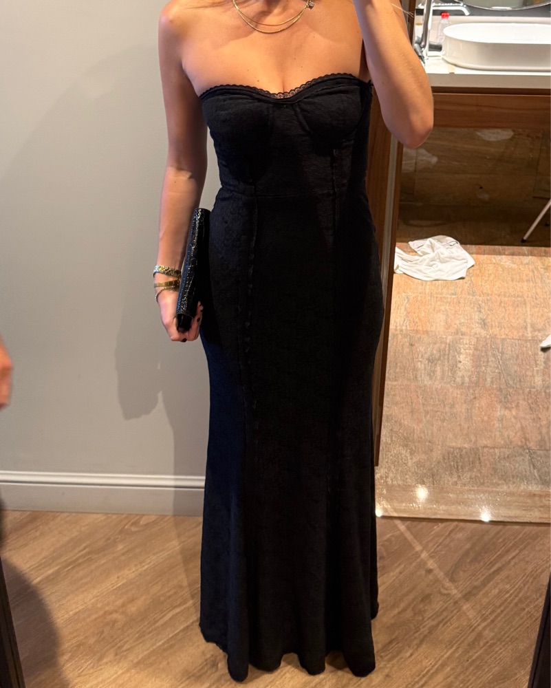 Worn once to a wedding, in perfect condition. I am about 5,4 and wore heels with this dress and it was perfect length!