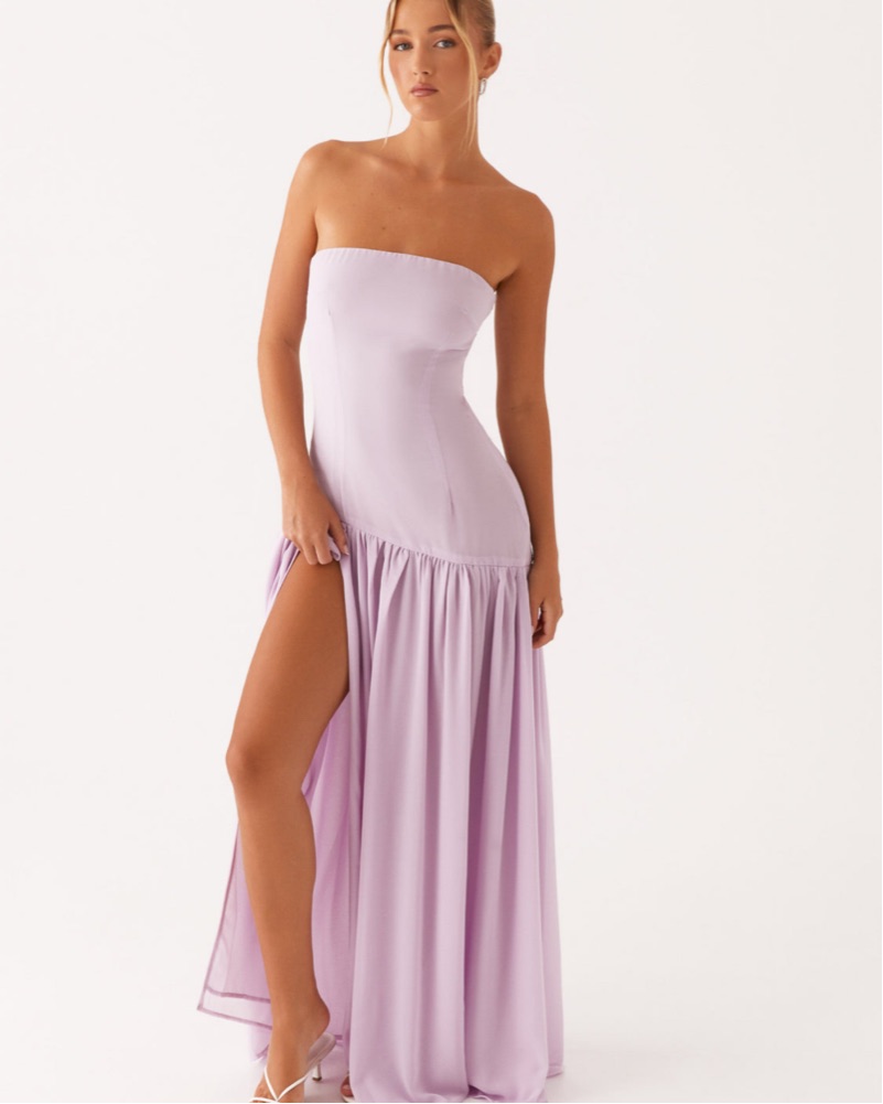 This stunning lilac maxi dress is perfect for a formal event or special occasion. The flowing silhouette and ruffle detail create a romantic and feminine look.