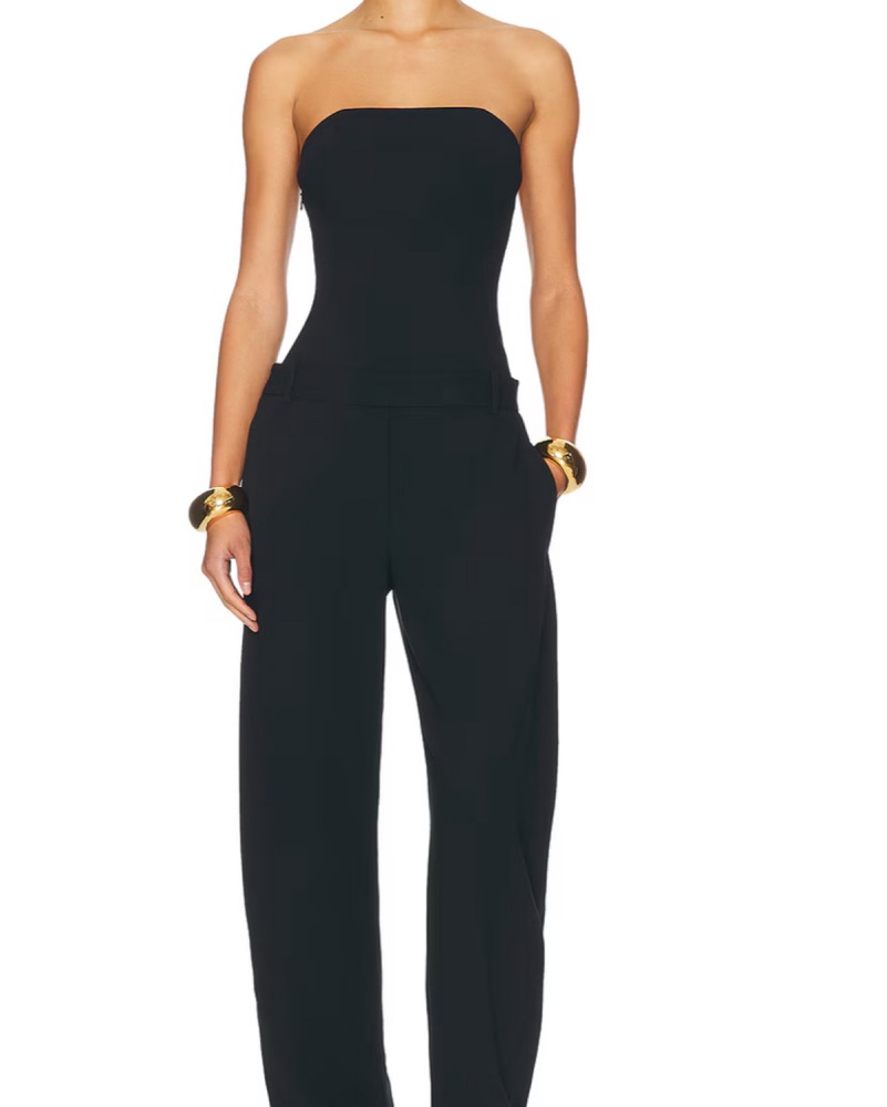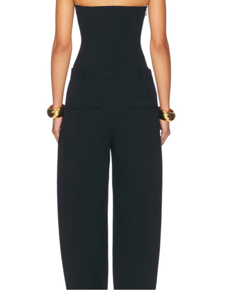 This stylish strapless jumpsuit is perfect for a night out or a formal event. The flattering silhouette and sleek black color make it a versatile piece that can be dressed up or down.