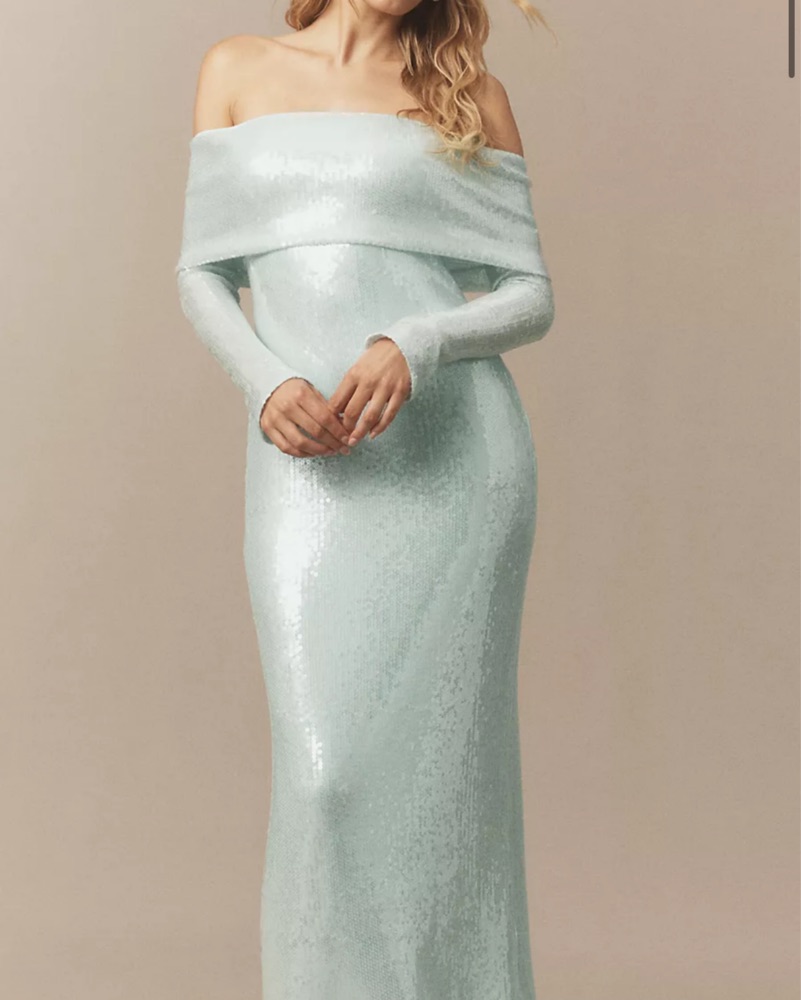 This stunning off-the-shoulder sequin gown is perfect for a glamorous formal event or special occasion. The figure-hugging silhouette and shimmering fabric create an elegant, eye-catching look.