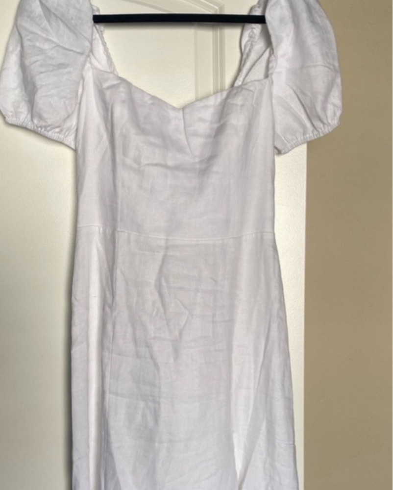 This beautiful white dress with puff sleeves and a midi length skirt is perfect for a formal event or special occasion. The textured fabric and flattering silhouette make it a sophisticated and timeless choice.