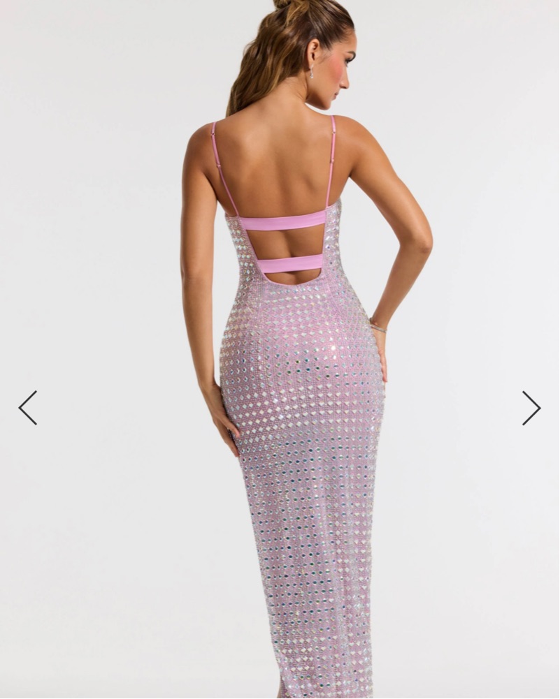 This stunning rhinestone-encrusted dress is perfect for a formal event or special occasion. The figure-flattering silhouette and high slit add an elegant and sophisticated touch.