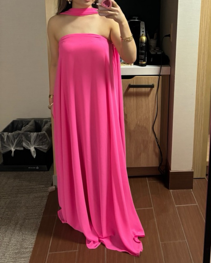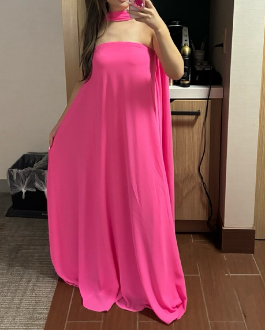 Hot pink/magenta floor length maxi dress with attached scarf/choker. Perfect for weddings or other formal, cocktail or black tie events. I received so many compliments wearing this! Tailored to around 5’5” height. XS but fits more like S. Top stretches and could def fit a S/M as well!