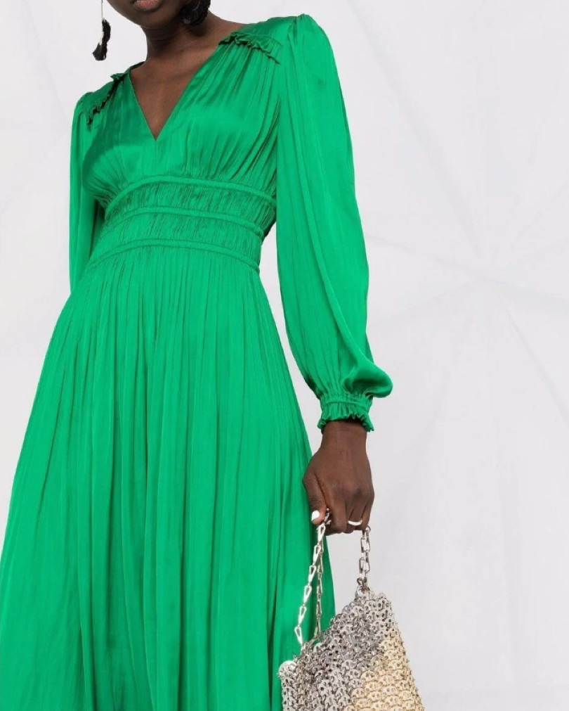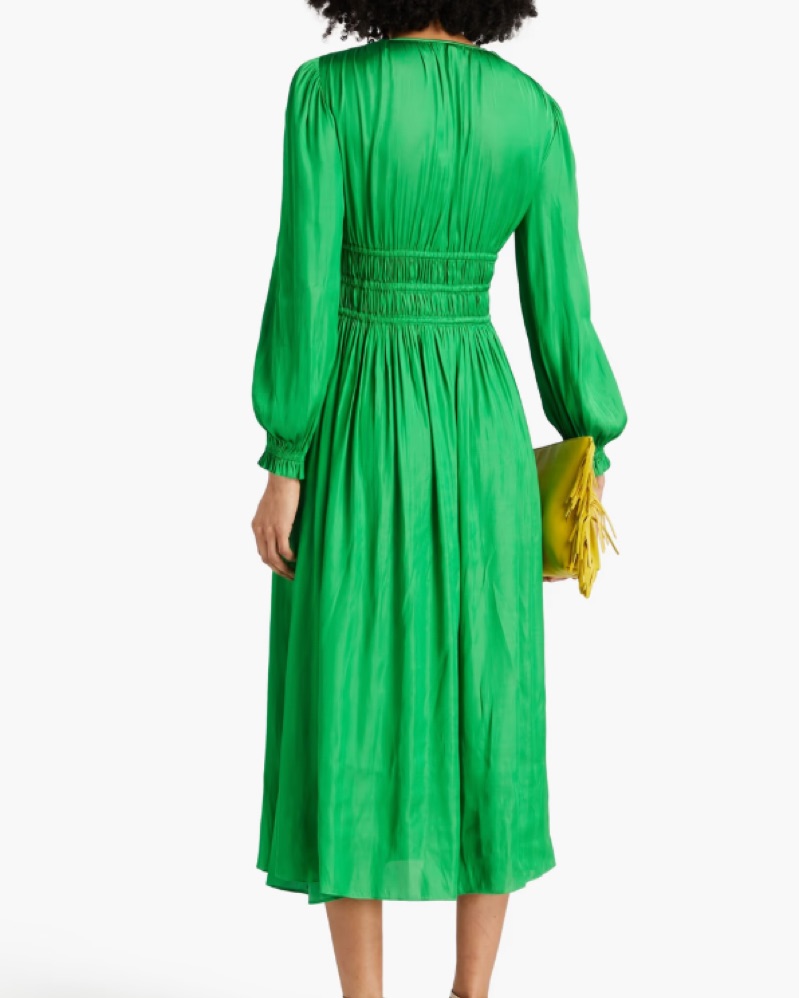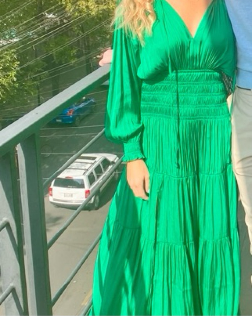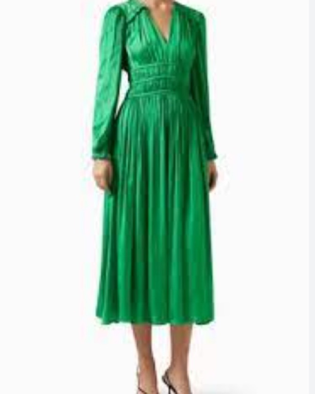 Silk emerald green dress from Maje. Long sleeves with a cinched waist hits above the ankle near mid calf.